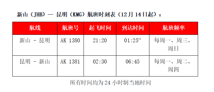 11月11日,亚洲航空正式宣布开通昆明至马来西亚柔佛州新山的双向定点直飞航线,这是目前唯一连接两地的低成本直飞航线,标志着亚航在吉隆坡以外的区域枢纽战略布局取得重要进展。该航线将于2025年12月14日正式首航,为中马两国贸易、旅游及文化交流搭建起高效便捷的空中桥梁。