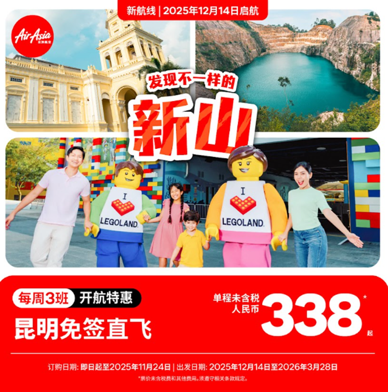 为庆祝新航线开售,亚航推出特别优惠活动,单程未税票价仅338元起(仅为单程航费,未包括税费、附营产品及其他费用),优惠预订期截至2025年11月24日,出行日期覆盖2025年12月14日至2026年3月28日。旅客可通过亚航官网、AirAsia MOVE应用程序及亚航微信小程序查询预订。
