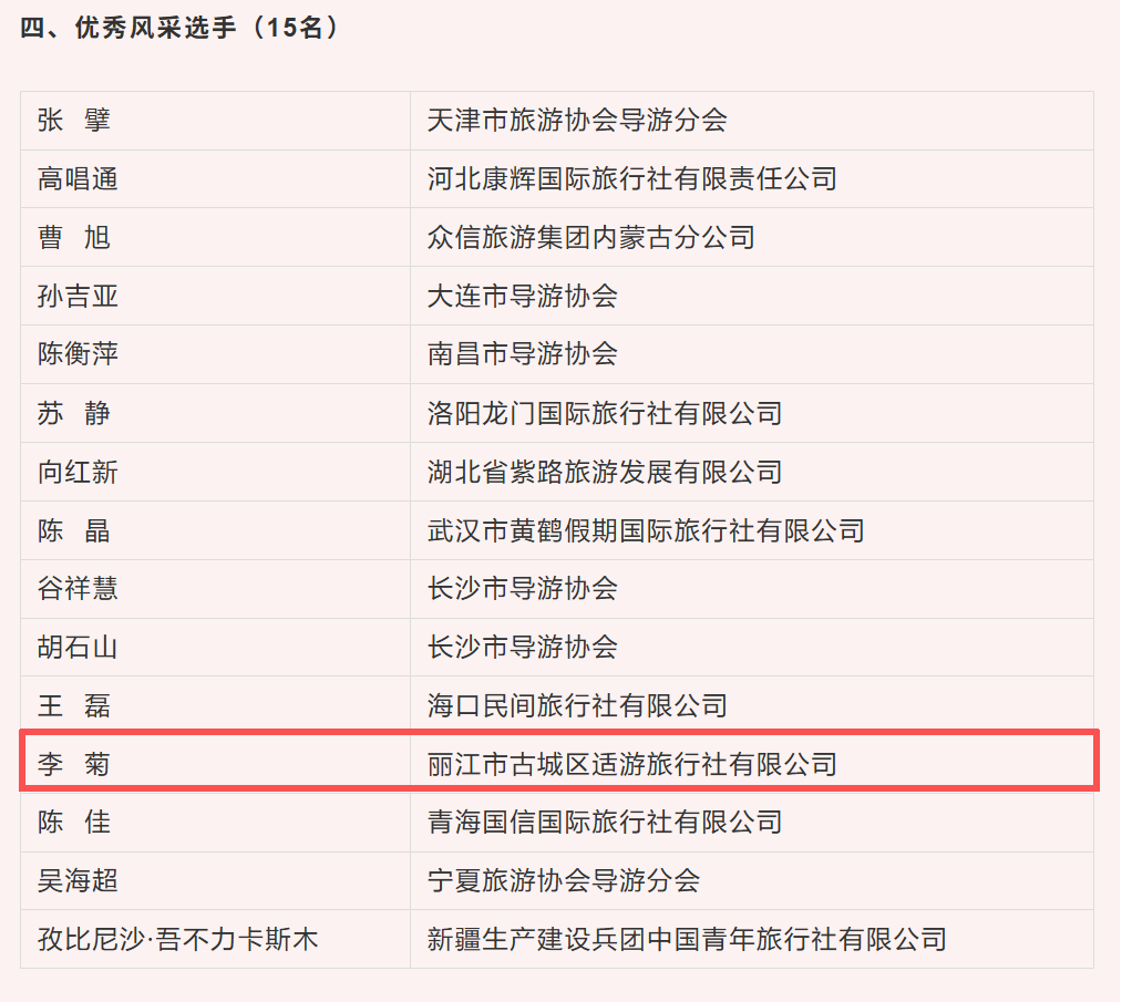 近日,由文化和旅游部、全国总工会、共青团中央、全国妇联共同主办的第六届全国导游大赛决赛圆满落幕。经过激烈角逐,大赛最终决出金牌导游员3名、银牌导游员6名、铜牌导游员9名、优秀风采选手15名。其中,来自丽江市古城区适游旅行社有限公司的导游李菊获优秀风采选手奖。