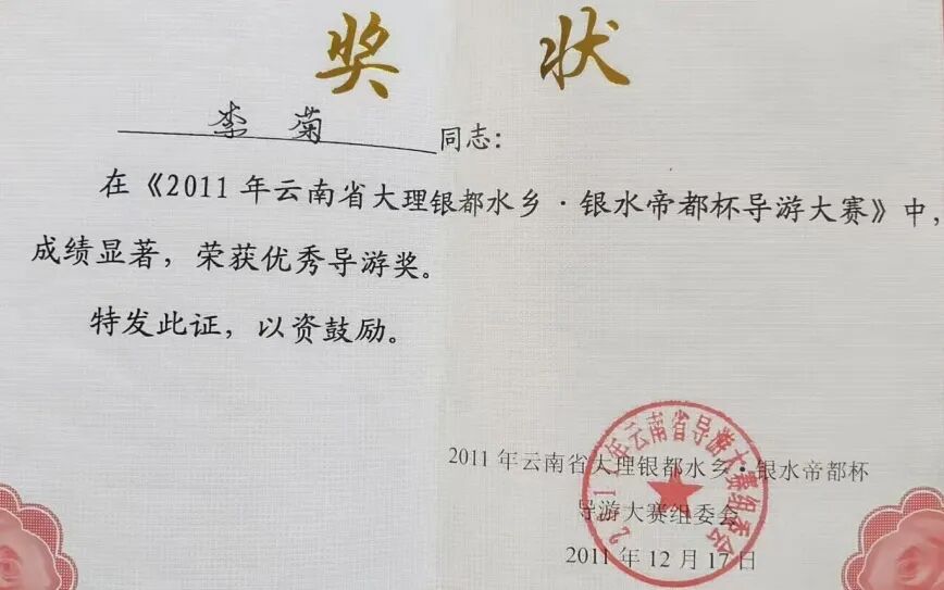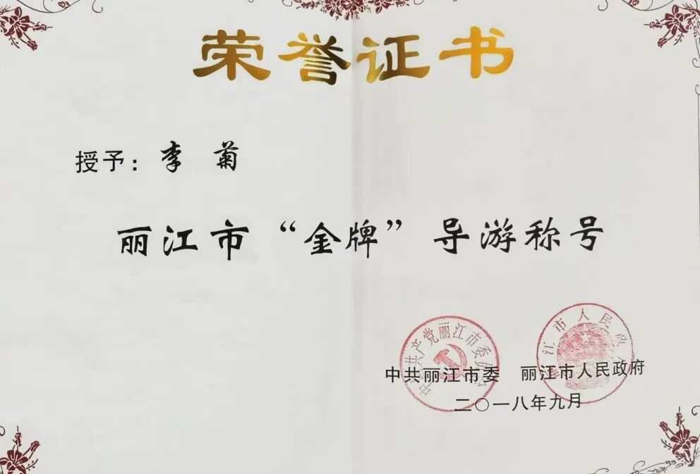 从业多年来,李菊的专业能力得到了行业和游客的认可:2011年获“云南省‘银都水乡’杯导游大赛优秀导游”称号,2018年获评丽江市金牌导游,2025年在云南省全国导游大赛选拔赛英语组中斩获一等奖。这些荣誉的背后,是她对每一次带团的精心准备,也是对导游职业的无限热爱。