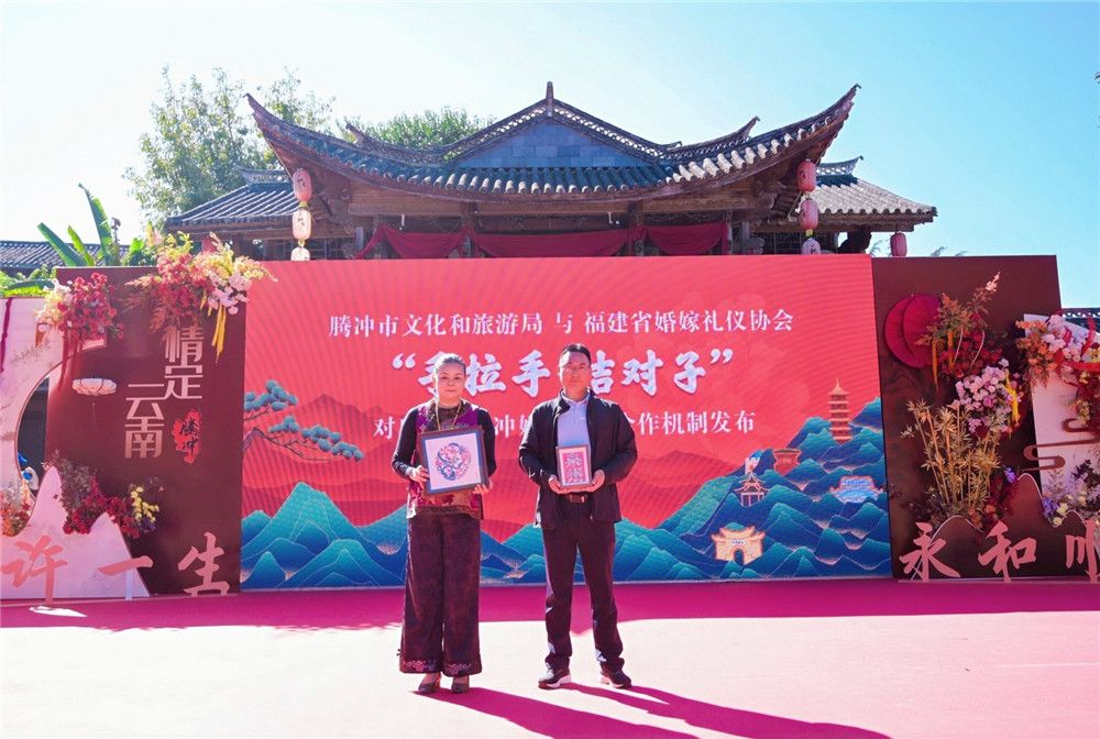 活动现场亮点频现,腾冲市文化和旅游局与福建省婚嫁礼仪协会发布了“手拉手 结对子”对口发展腾冲婚庆旅游合作意向,双方将充分发挥腾冲的特色资源与文化底蕴,以及福建省婚嫁礼仪协会在行业组织、市场渠道方面的专业影响,在互设服务窗口、联合开发产品、共同推广营销等方面深化婚庆旅游合作。