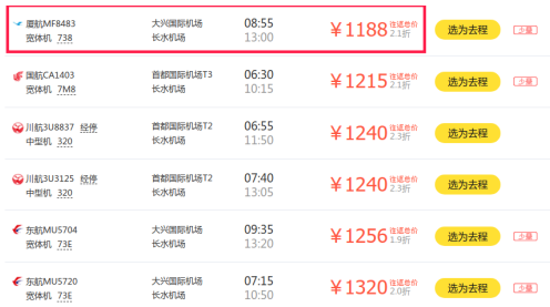 从行程看,北京至昆明出发时查询的往返机票价格最低为1188元。