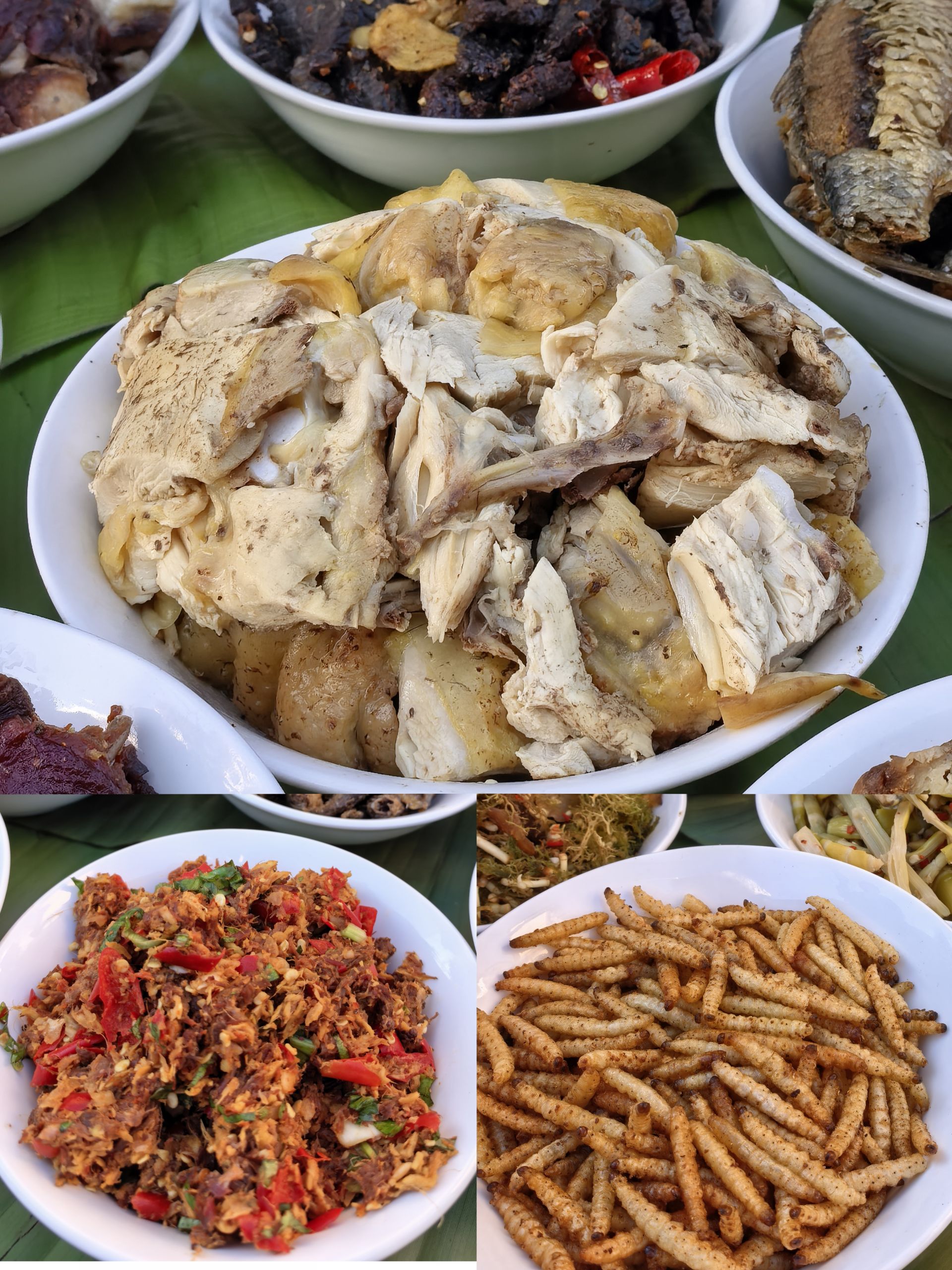竹蔑桌上,摆放着各种各样的哈尼风味。哈尼蘸水鸡、稻花鱼、咸鸭蛋、炸竹虫、凉拌树花等美食,不仅食材独特,更是哈尼族地道的风味,无一不令人惊叹。