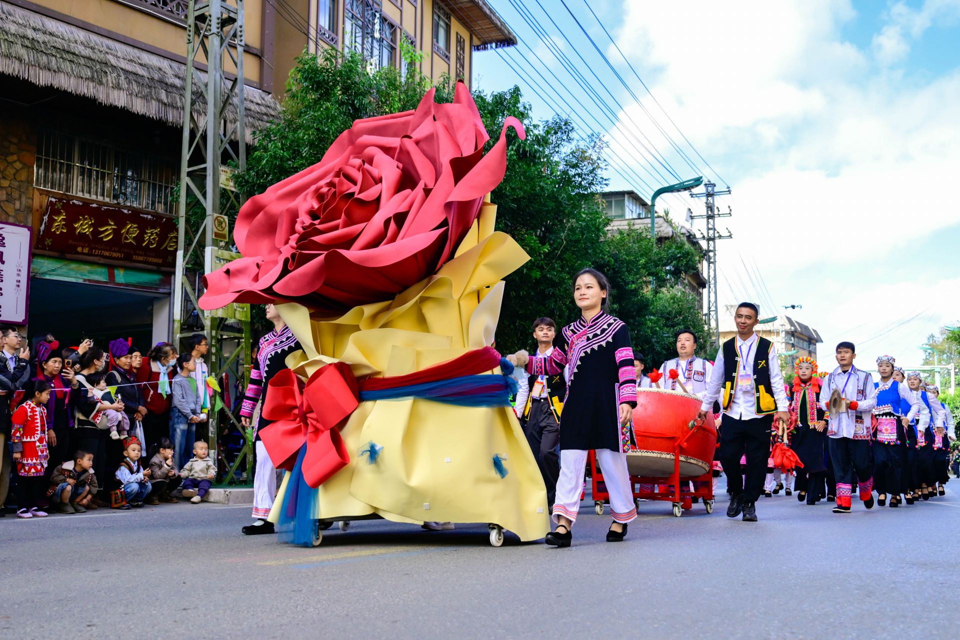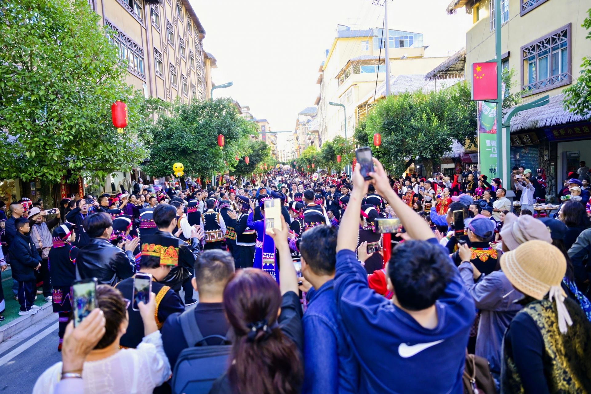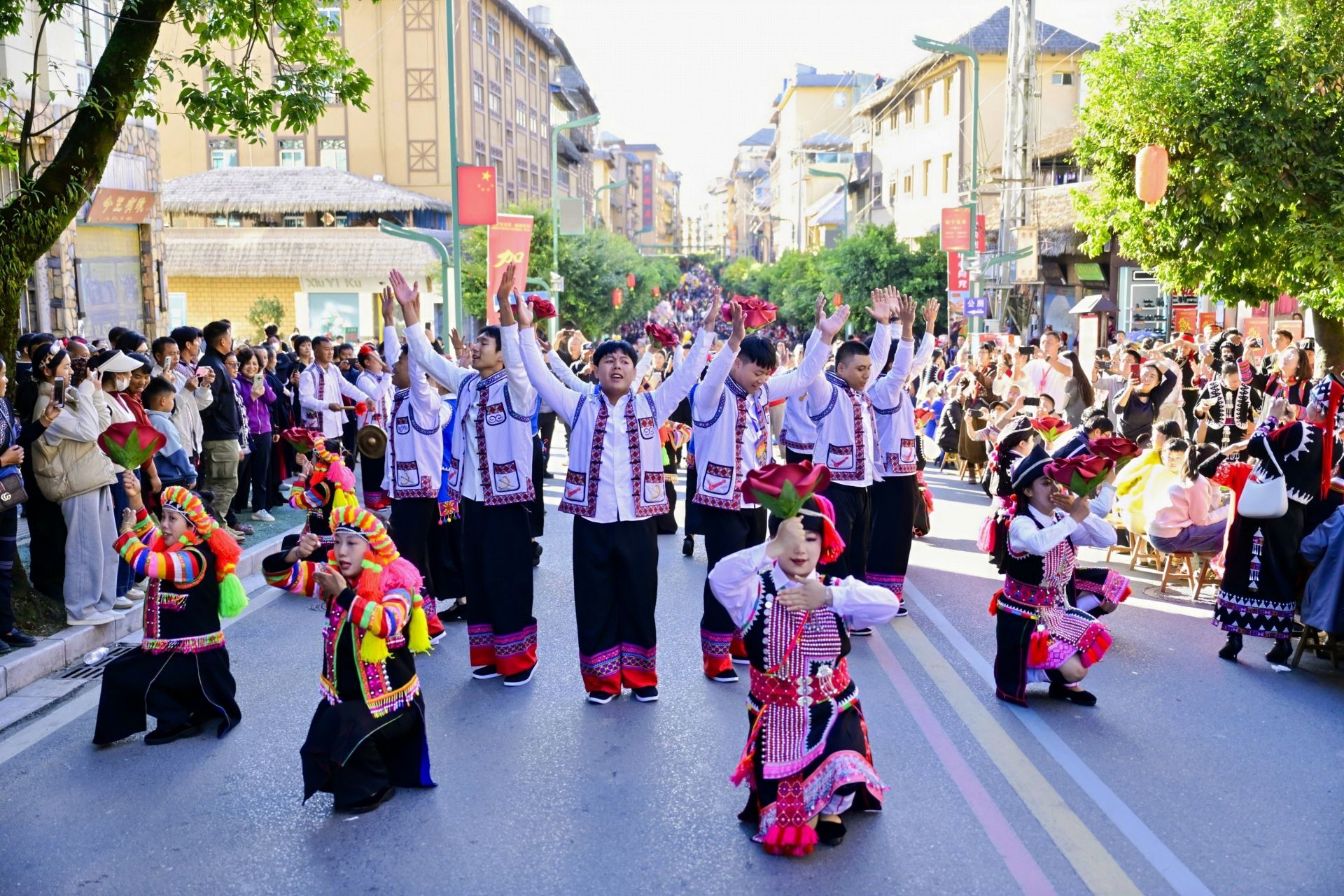一路上,礼俗文化方阵、乡镇民族文化方阵、院校方阵、建水烟盒舞方队、企业方队轮番上阵。既展现了哈尼族千年文明的深厚底蕴,更勾勒出各民族交融共生、乡村振兴蓬勃发展的生动画卷。