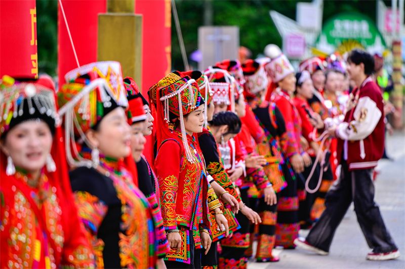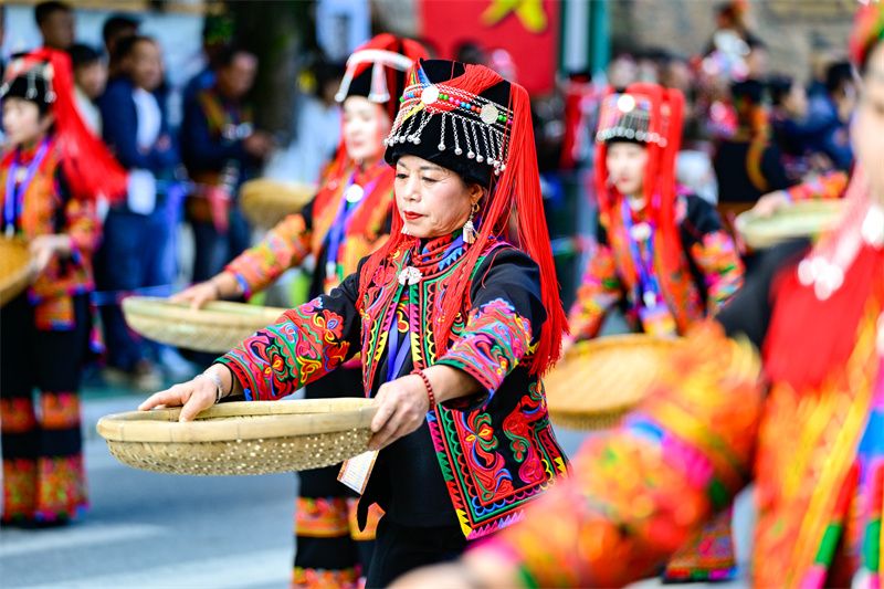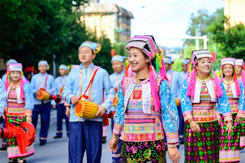 这场舌尖上的交融,只是当天绿春民族团结交响曲的动人序章一角。盛宴开启前,一场精彩纷呈的民族文化大巡游率先点燃全城热情。由锣鼓队、咪谷方队组成的礼俗队伍,庄严再现古老祭祀仪式;各乡镇民族方队载歌载舞,生动展示着绿春丰富的农耕文明和民俗风情。特别值得一提的是,今年巡游队伍中新增了大学生方阵、建水烟盒舞方队和企业方队,多元文化的交融互动,赢得沿途观众阵阵喝彩,展现了各民族交往交流交融的生动图景。