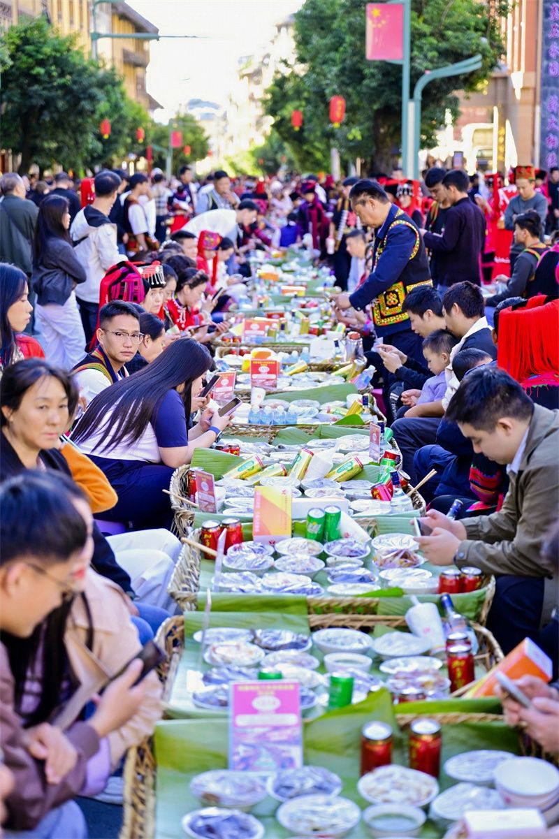 被誉为哈尼族“春节”的“十月年”,是庆祝丰收、祈福纳祥的重大节日。当日16时30分,随着哈尼族 “龙头” 一声祈福令下,绵延近5公里的3265桌长街古宴正式开席,万人同席、举杯共欢的壮观场景,再现了2004年获评“天下最长宴席” 的基尼斯风采。席间,身着民族服饰的哈尼族姑娘们,端着醇香的闷锅酒穿梭席间,主动为游客添酒布菜;来自五湖四海的游客与本地各族群众围坐一席,或举杯共饮,或交流合影,陌生的距离在共品一菜、共饮一杯中悄然消融;大家互道祝福,桌连桌、人挨人的热闹场景中,“各美其美、美美与共”的理念悄然传递,欢声笑语伴随着铓鼓的节奏,在街道上空回荡、汇聚,生动诠释着“中华民族一家亲”的深厚情谊。