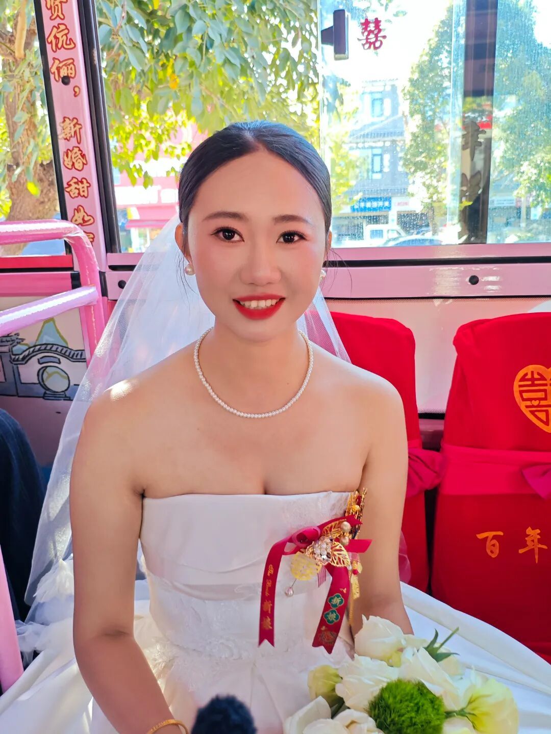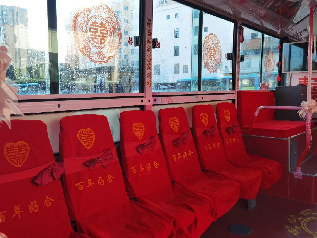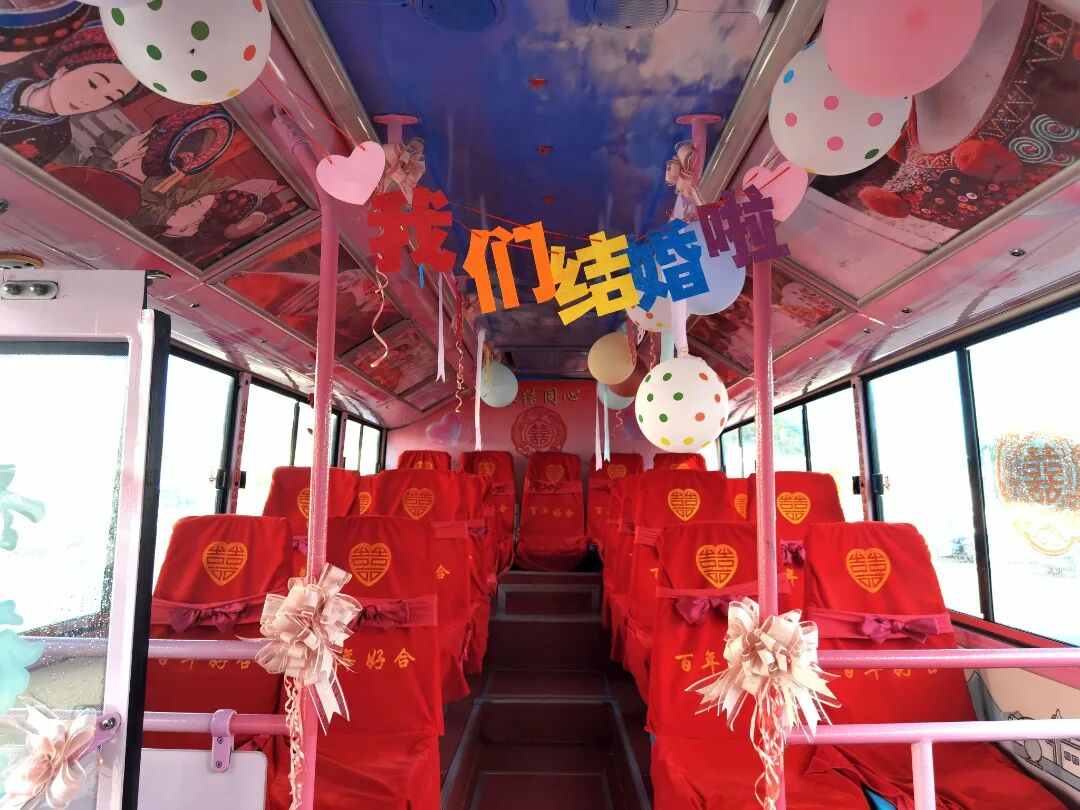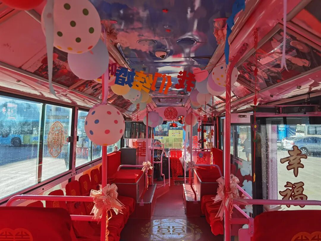 当爱情邂逅城市烟火,婚礼也可以充满独特的仪式感。我现在是在大理公交推出的“公交婚车”“520幸福专列”的车内,车厢内以粉色和红色为主调,装饰温馨浪漫,氛围感十足。这一创新服务让新人在亲友陪伴下,开启一场“全城见证”的低碳环保浪漫旅程。