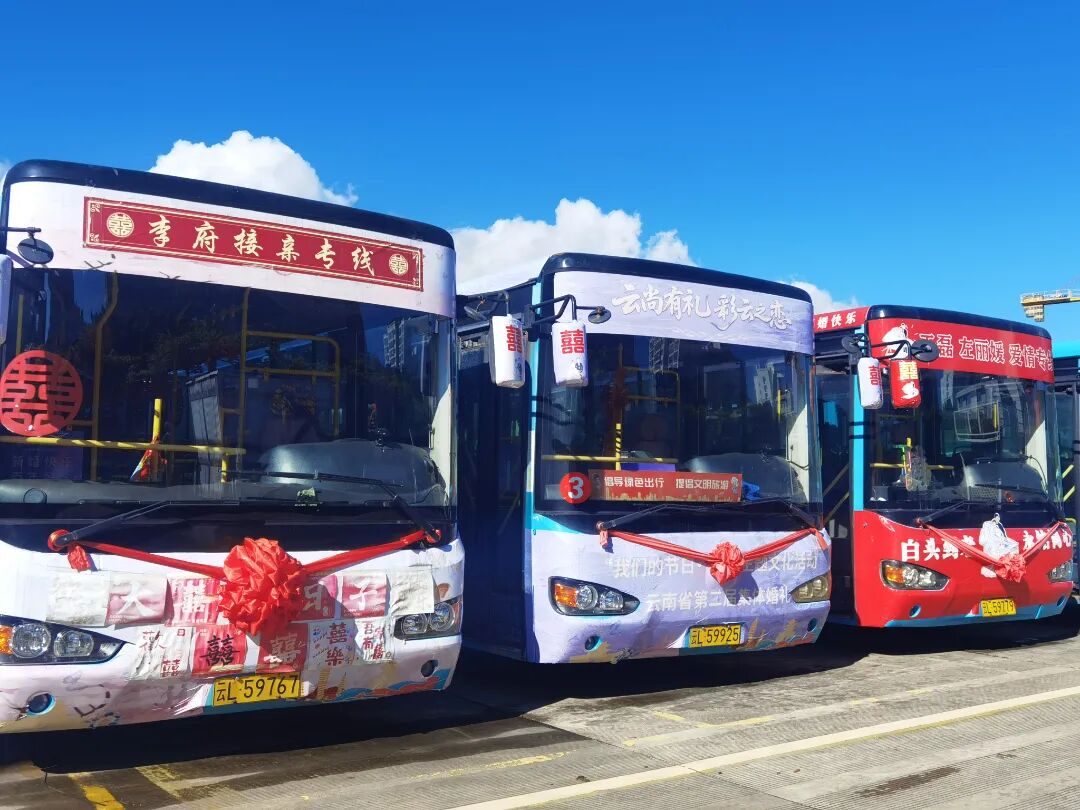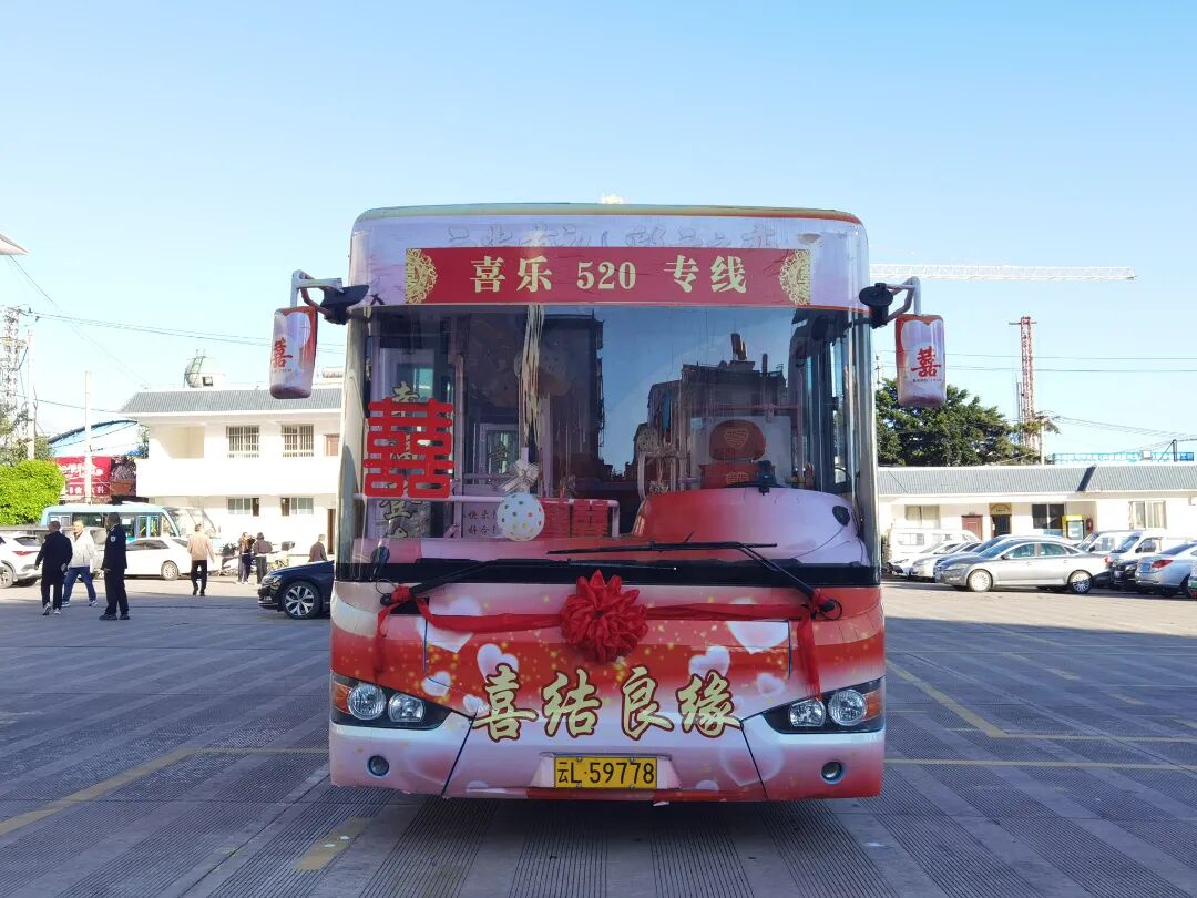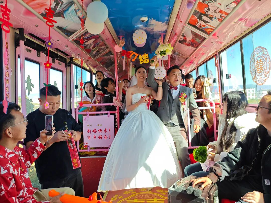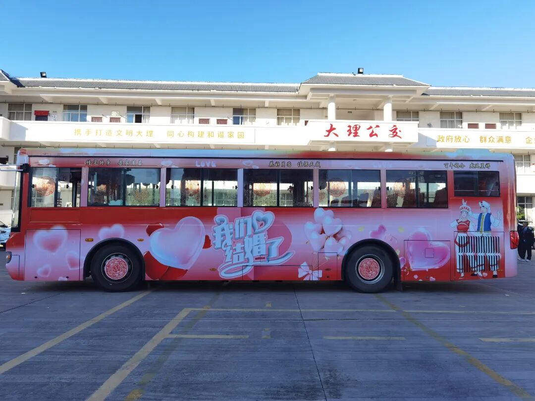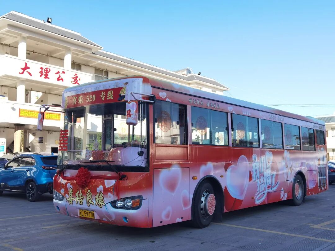 据大理公交公司“520幸福专列”负责人介绍,新人还可以根据喜好和需求进行个性化定制,将爱情故事、共同爱好、主题色系等元素融入婚车装饰,让整场婚礼从接亲环节开始就充满独一无二的个人印记。