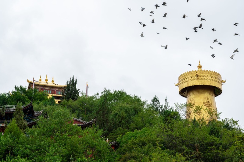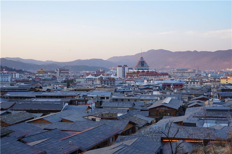 来到这里,一定要爬一次龟山公园。140级台阶是高原给你的温柔试炼,登顶时,世界最大的21米鎏金转经筒会撞进视线。这尊重达60吨的巨型景观需8人合力才能推动,每顺时针转三圈,便将一份纯粹的美好与祈愿揉进风里。此刻俯瞰古城,藏式碉楼与纳西木屋织成八瓣莲花的轮廓,远处石卡雪山的雪光,正和转经筒的鎏金交相辉映,构成一幅壮阔又治愈的高原画卷。