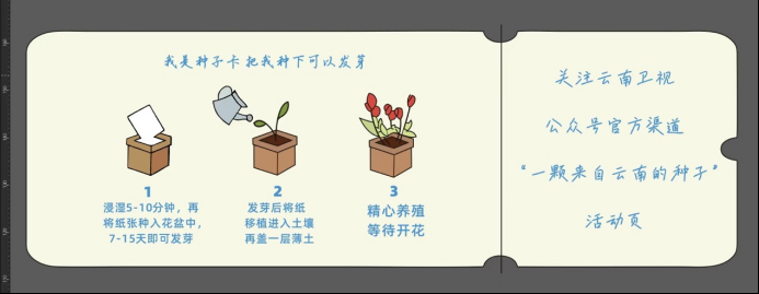 云南展区活动现场,每日限量发放200张“云南种子卡”,每张卡片都承载着云南的自然密码。拿到种子卡的观众,可按照专属种植指南培育希望:先将种子卡浸湿5-10分钟,再种入花盆中,7-15天便能见证新芽破土;发芽后,将种子卡移植到土壤里并覆盖一层薄土,精心浇灌照料,不久后就能收获属于自己的云南鲜花。当花朵绽放,拍摄美照提交至云南卫视官方渠道,审核通过后可领取电子礼品券,凭券在下一届长三角文博会云南展区,兑换“神秘好礼”——让今年的种子长成明年的花,明年的展会再续今日的缘,完成一场浪漫的“鲜花与种子的约定”。