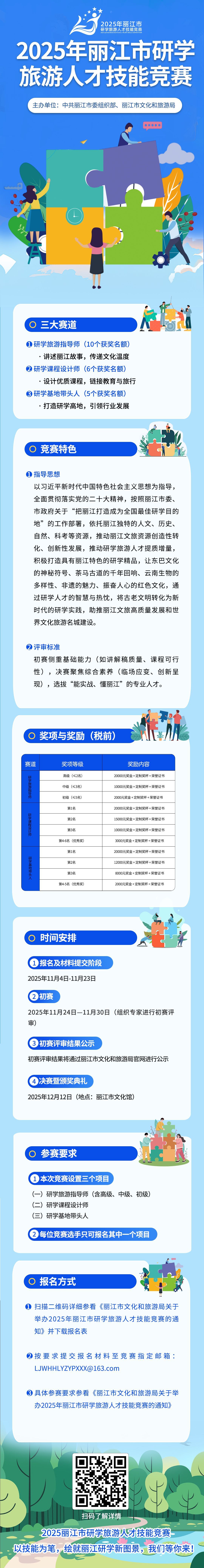 本次竞赛不仅是技能比拼的舞台,更是丽江研学旅游高质量发展的重要抓手。通过赛事,将进一步整合丽江丰富的历史文化、自然生态、非遗传承与红色资源,推动研学课程、线路与基地建设的系统化、专业化、品牌化发展。欢迎大家踊跃报名,积极参与到赛事中来。