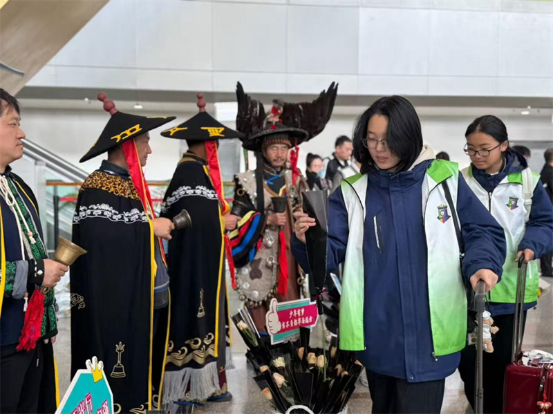 彝乡献礼,暖心启程。研学之旅首站抵达昆明,楚雄州彝族毕摩为每一位学子祈福,送上祝福语。这场别样的接机仪式,为本次研学之旅注入了浓郁的云南韵味。