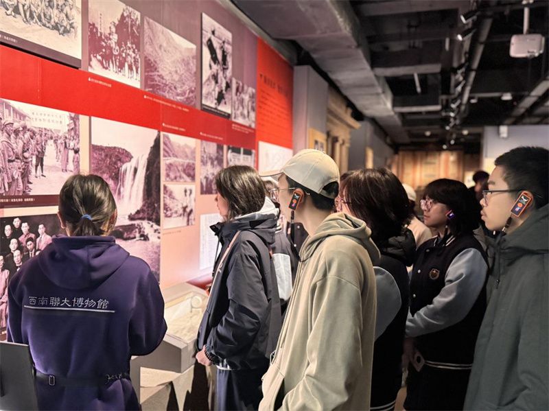对话亿万年的地质史诗,感悟自然造化。接机仪式后,学子们走进世界自然遗产“石林”,实地考察石峰、溶洞和地下河,探究石灰岩的形成机理与演化历史,穿梭于奇特的“石头森林”,不禁为大自然的鬼斧神工所震撼;走进西南联大博物馆,在泛黄的史料与复原的课堂场景中,追寻抗战时期学术薪火相传的足迹,感悟先辈们坚韧不拔的治学精神与学子们的求知热忱;探访云南省博物馆,从远古石器到古滇青铜,从茶马古道遗存到多元民族文物,一馆尽览云南千古风华,构建起对云岭大地的历史认知。