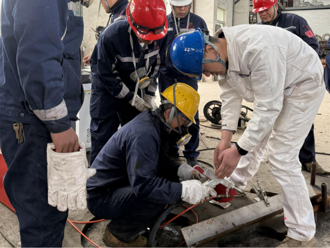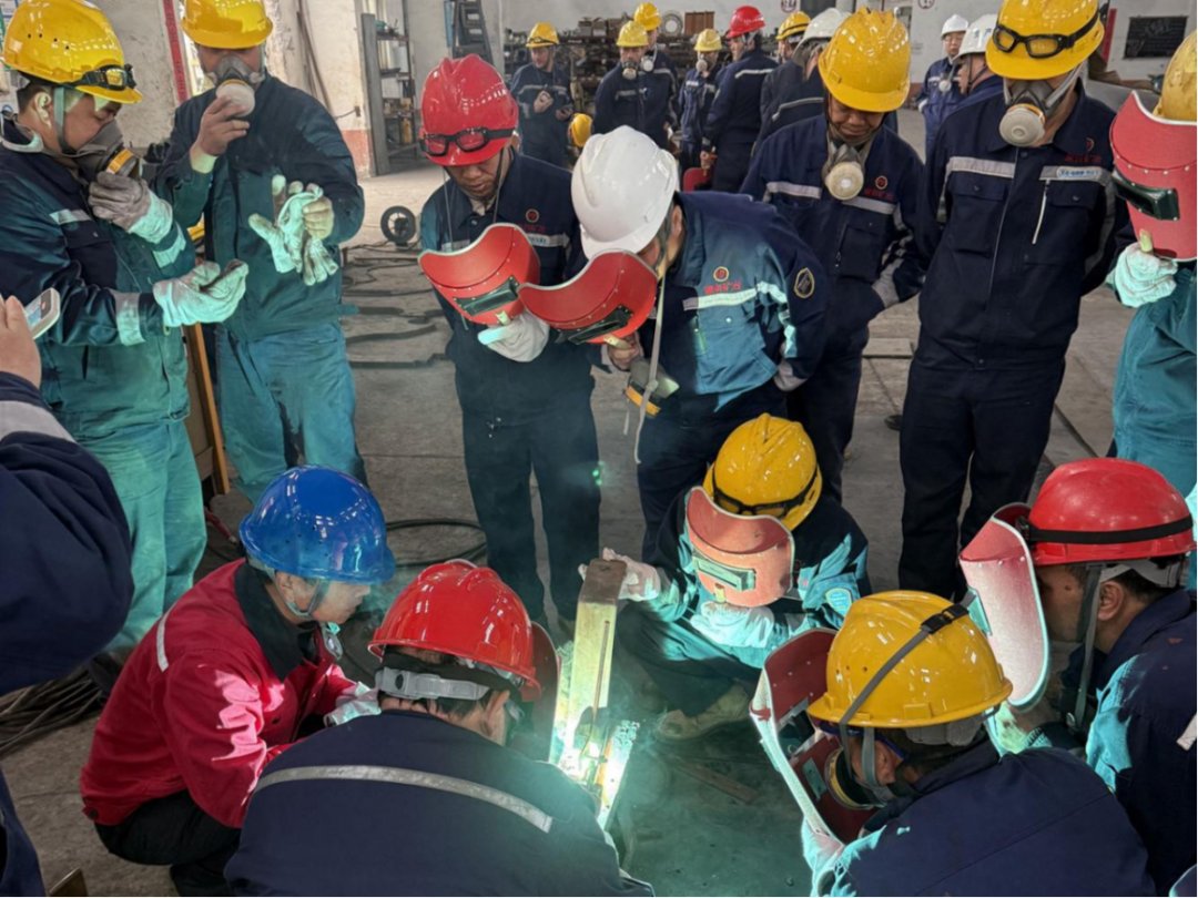 “专家们讲的就是我们在实际操作中最困惑的地方!”一位年轻焊工在培训后感慨道。在第二天的“车间课堂”上,两位劳模将理论讲解转化为实操教学:魏东手把手指导学员制作碳弧焊焊枪,细致讲解操作要点;李亚组织工人在不锈钢管道旁分组练习,逐一纠正操作姿势,并分享预防变形的实用技巧。这种面对面、手把手的教学,不仅解决了当下的技术难题,更将劳模多年总结的工艺标准和操作心得倾囊相授,帮助工人们实现从“会操作”到“懂原理”的跨越。