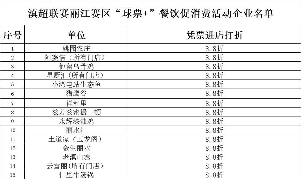 持有“滇超联赛”丽江赛区观赛门票的球迷,前往姚园农庄、阿婆情、他留乌骨鸡等店面消费享8.8折优惠。