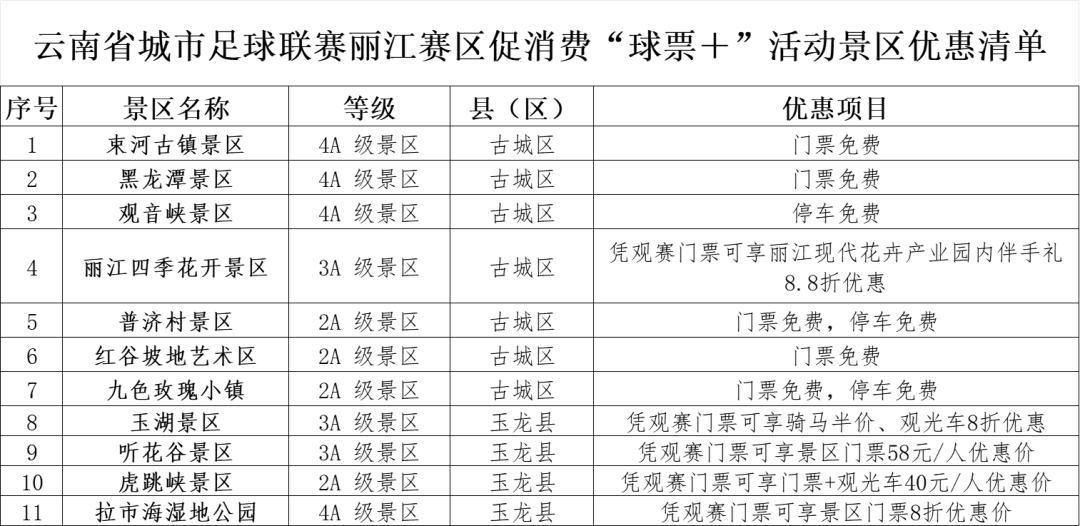 持有“滇超联赛”丽江赛区观赛门票的球迷,可享受以下福利:前往束河古镇、黑龙潭公园等景区免门票;游览虎跳峡景区、玉湖景区、拉市海湿地公园享门票优惠。