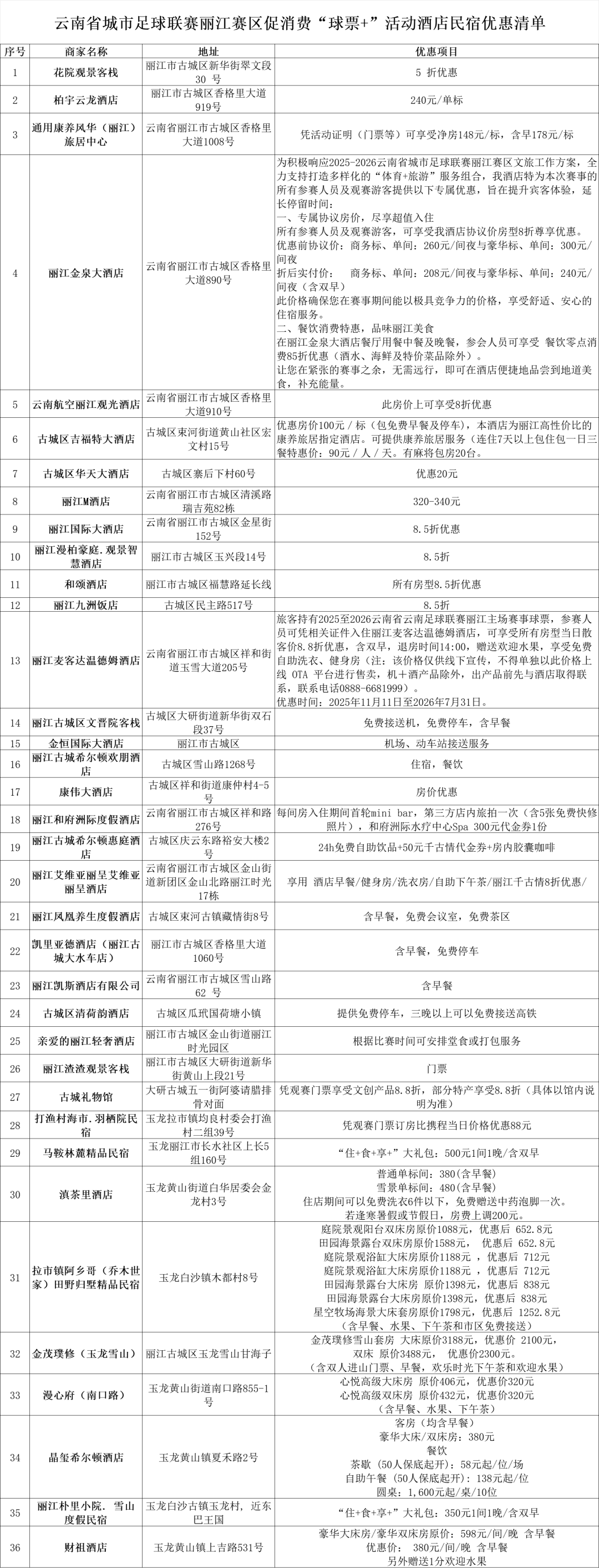 持有“滇超联赛”丽江赛区观赛门票的球迷,入住以下合作酒店可享优惠减免福利。