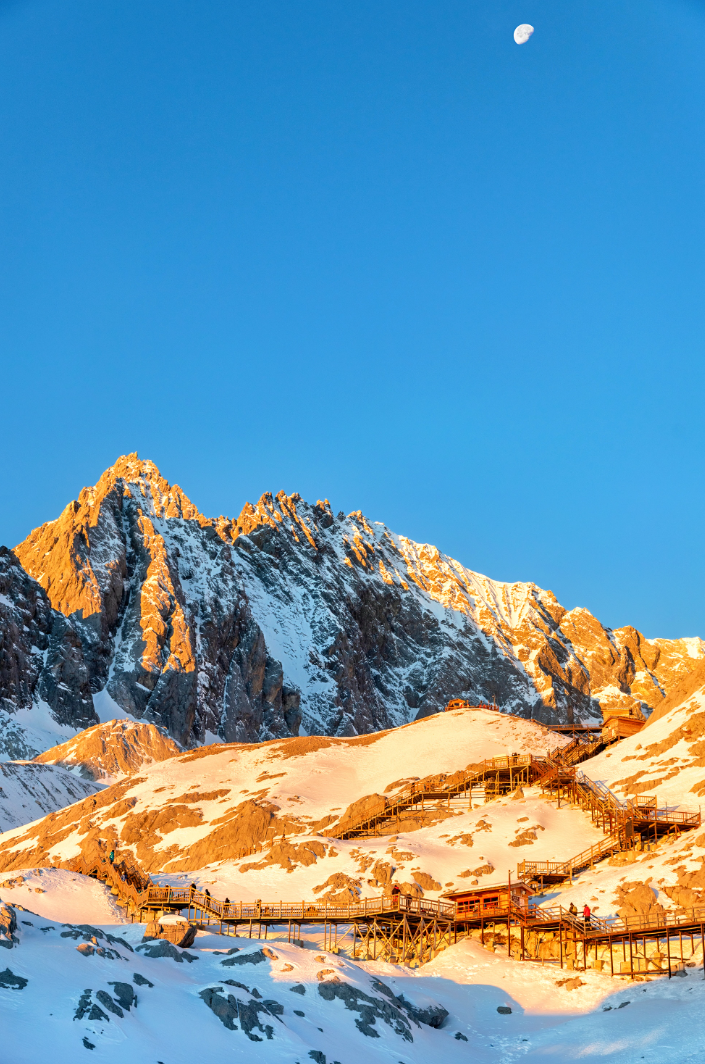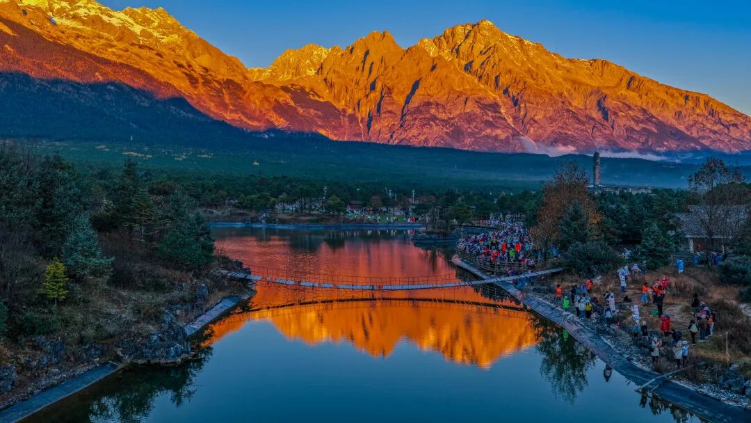 传说能看到“日照金山”的人,会幸运一整年!第二天我们要起个早,去迎接一份好运。进入玉龙雪山景区后,第一站可以先到甘海子,这片高山草甸是远眺玉龙雪山十三峰全景的绝佳位置,也是捕捉“日照金山”的绝佳视角。7时35分许,第一缕阳光精准地投射在雪山之巅,随着阳光顺着山体缓缓向下蔓延,整座雪山像披上了灿烂夺目的金色华服,场面震撼,令人叹为观止。嘿!别发呆啦,快对着“金山”许下你的心愿吧!