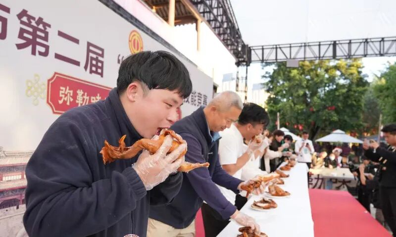 互动体验区同样人气高涨。“匠心美食打卡点”前,市民游客纷纷举起手机记录精彩瞬间,凭社交平台分享截图即可兑换美食券,品尝各店特色;新设的“吃鸡大赛”将气氛推向高潮,二十位市民同场竞技,在欢快的哨声中角逐“吃鸡大王”荣誉。