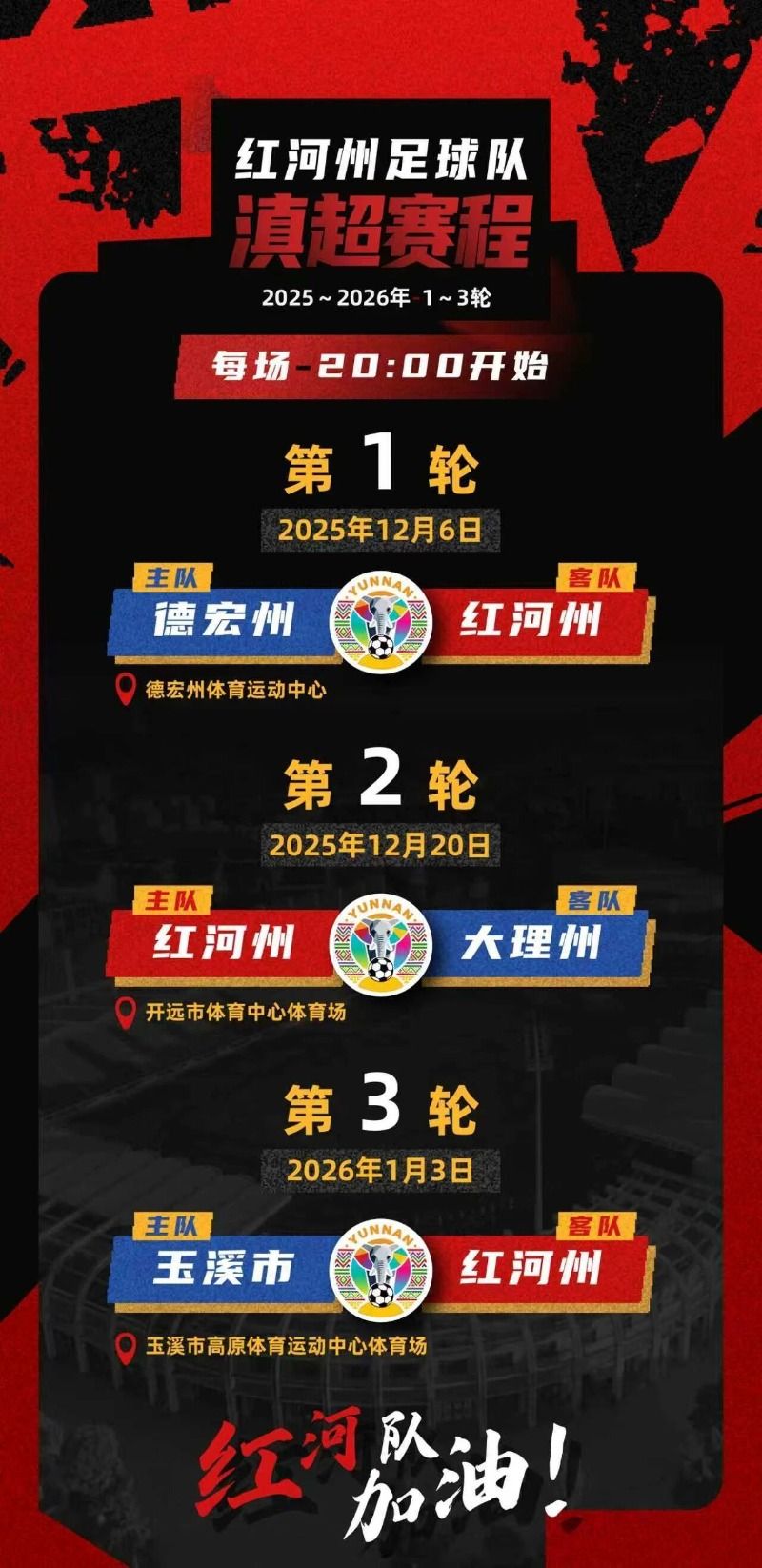 当球迷的欢呼声响彻开远体育中心,当篝火在阿细跳月节拍中燃起,当鲜美的过桥米线熨帖脾胃,你会发现红河早已把最动人的故事写进了你的行囊。让我们一起跟随“滇超”的步伐,走进红河,拥抱红河,感受红河的美好!后续,红河文旅还将为球员及球迷朋友们推出更多福利,敬请期待!