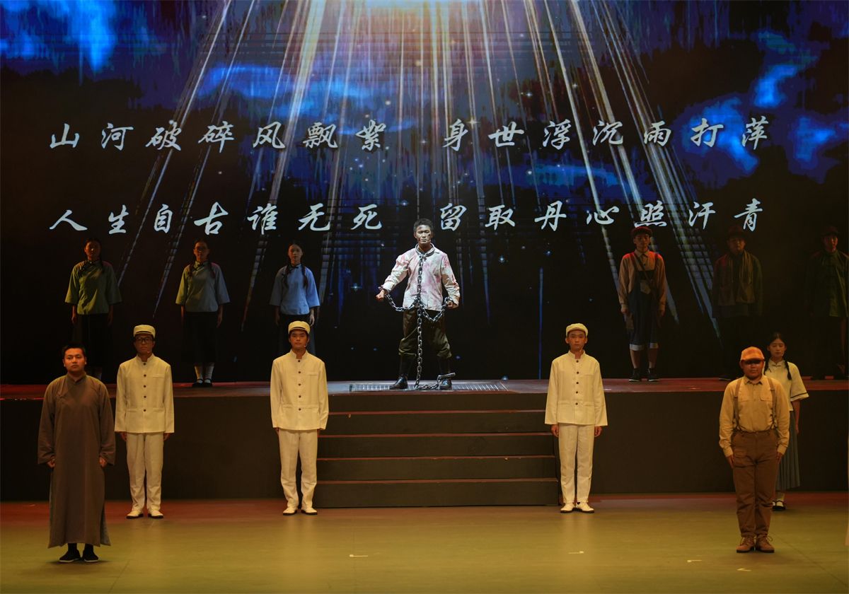 随后,由学院师生自编自演的楚雄党史人物故事红色思政舞台剧《彝山星火》正式上演。该剧以楚雄本土红色历史为创作根基,聚焦张经辰、张舫、毕昌杰、赵祚传、曹庆功五位革命烈士的真实生平事迹,采用“宣讲+情景”的创新表达形式,巧妙融合音乐、话剧、舞蹈与多媒体技术,以“星火”为核心意象,通过“离别”“追光”“铭刻”“家书”“英雄”五幕剧情,生动再现了革命先辈矢志不渝的忠诚、视死如归的气概和深沉的家国情怀。演职人员以真挚的情感、精湛的表演,让红色历史“活”了起来,为现场观众呈现了一堂直击灵魂的“沉浸式思政课”,引发强烈的情感共鸣与精神震撼。