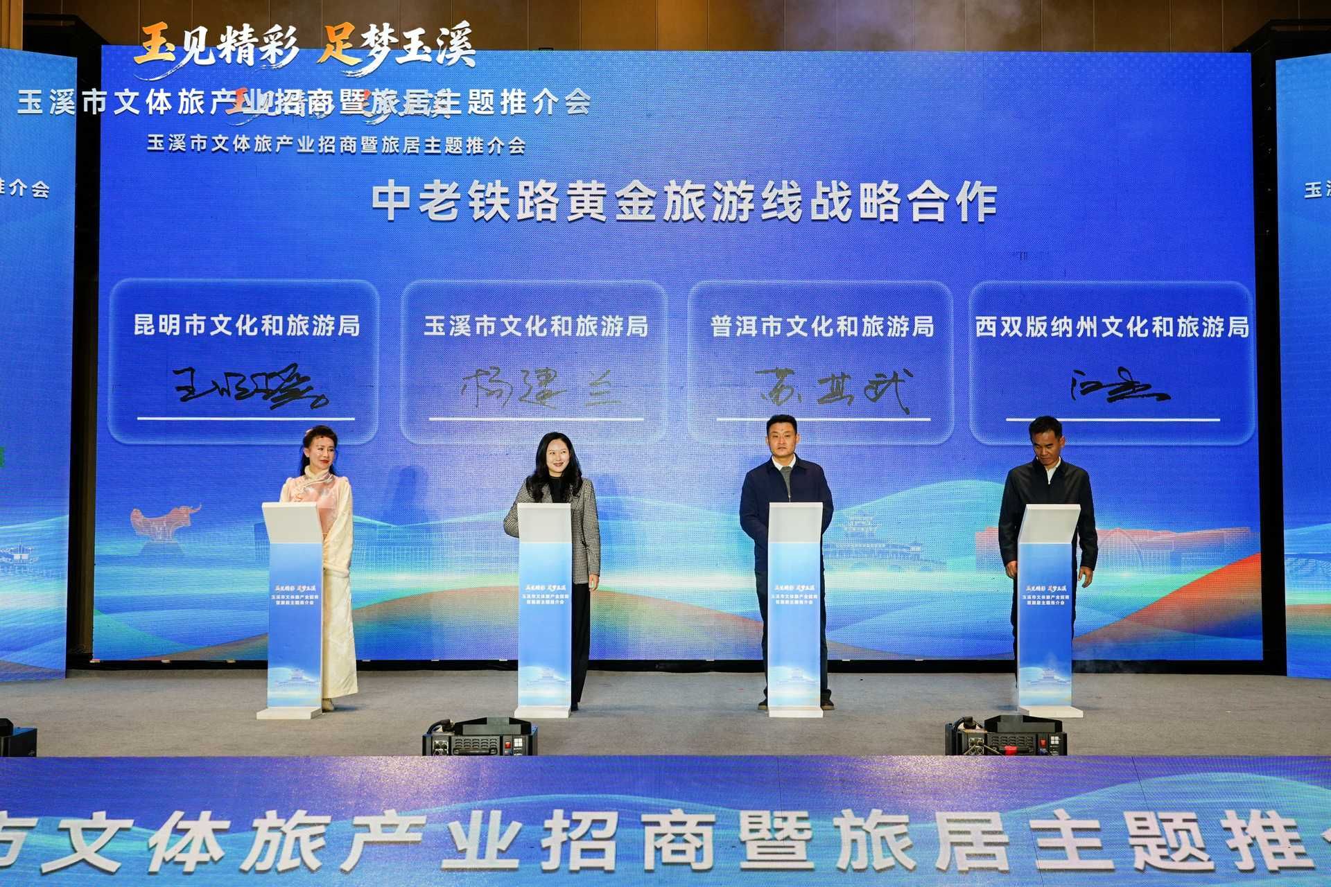 11月29日,玉溪市文体旅产业招商暨旅居主题推介会在玉溪中玉酒店成功举办。会上,昆明市文化和旅游局、玉溪市文化和旅游局、普洱市文化和旅游局、西双版纳傣族自治州文化和旅游局共同签署了《中老铁路黄金旅游线战略合作协议书》,标志着四州市文旅合作迈入协同发展、共建共享的新阶段。