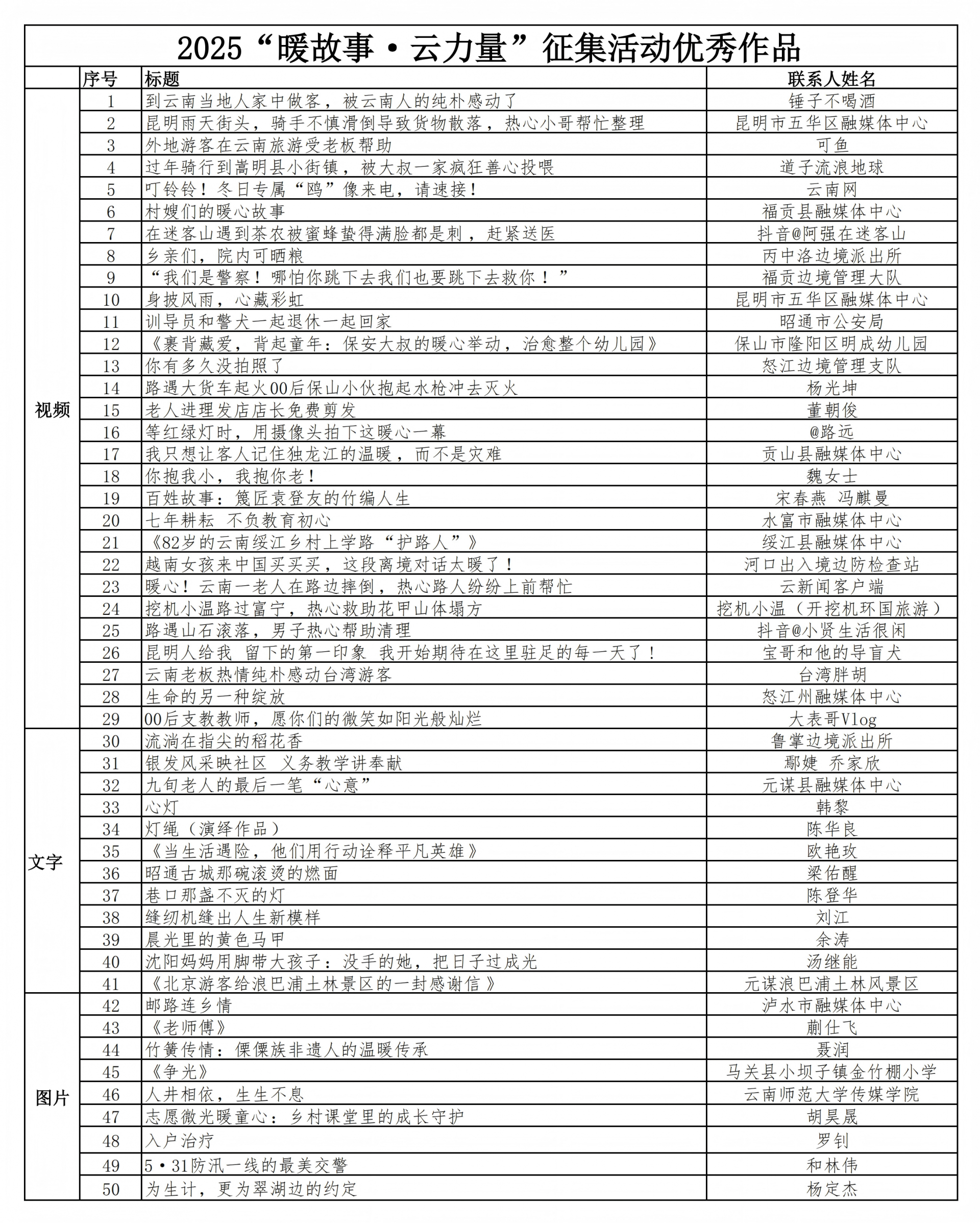 微光成炬,涓滴成河。在这个步履匆匆的时代,总有一些不期而遇的温暖,如春风拂面,悄然治愈着我们的心灵。由中共云南省委网信办主办、云南报业传媒集团全媒体运营中心、云新闻客户端共同承办的“2025云南美好生活·文明花开彩云南”系列活动之“暖故事·云力量”主题作品征集活动自9月19日启动以来,得到了社会各界的广泛参与。目前,活动的作品征集、网络投票环节均顺利完成。