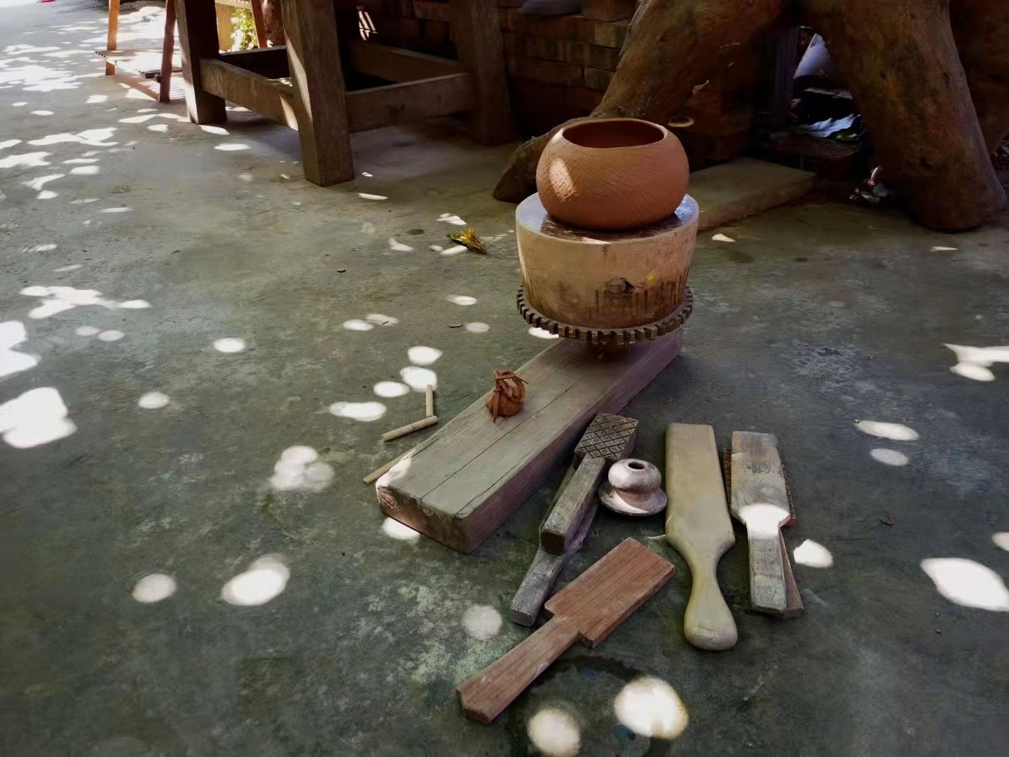 傣族慢轮制陶最动人的地方,在于其全程无机械、纯手工的制作流程。没有复杂的设备,只有一个由木材制成的“慢轮”——轮盘直径约一米,下方用石头或木桩固定,转动时全靠工匠用脚蹬踩,转速缓慢却稳定。正是这份“慢”,让工匠能精准把控泥土的形态,赋予陶器独特的灵魂。傣陶的原料取自当地黏土,经过淘洗、揉泥、塑形、修坯、晾干等工序后,采用露天堆烧的方式烧制。