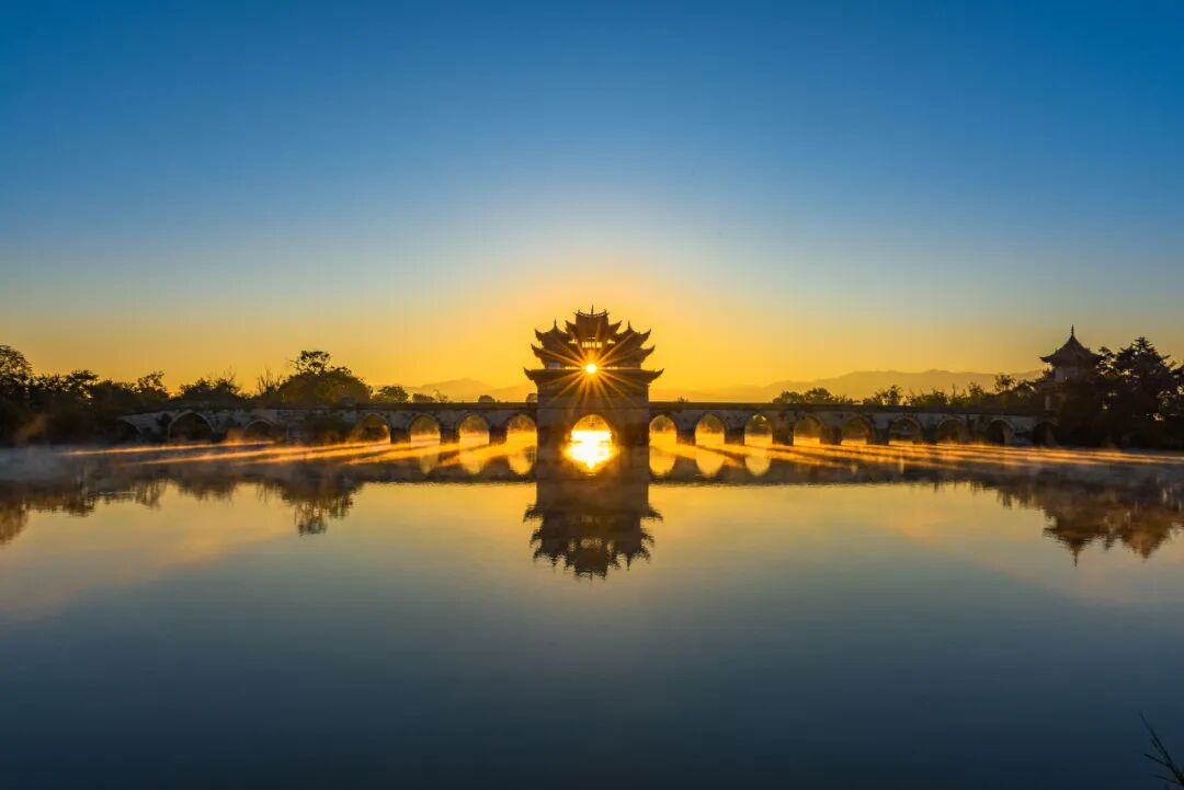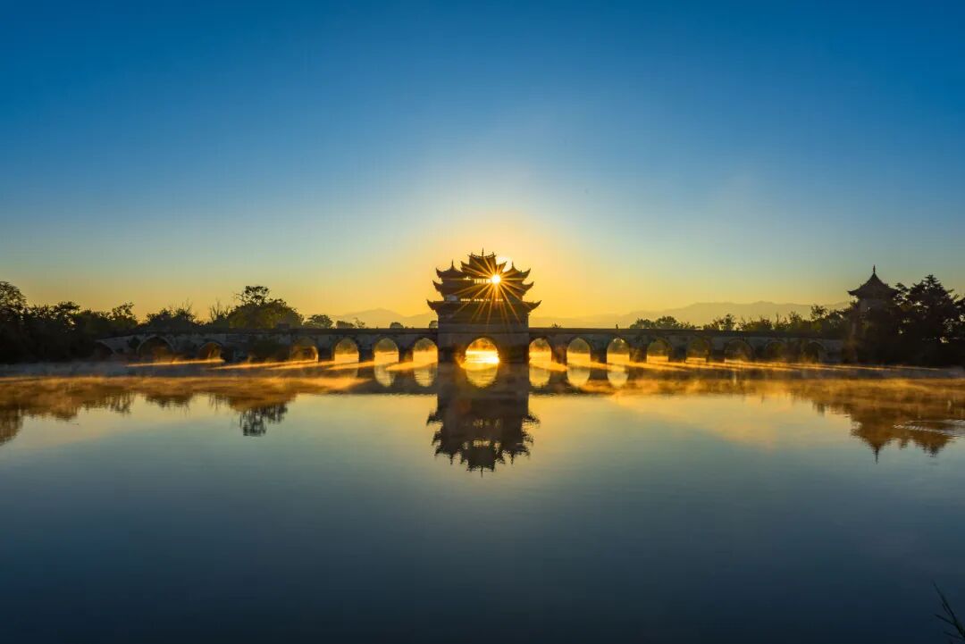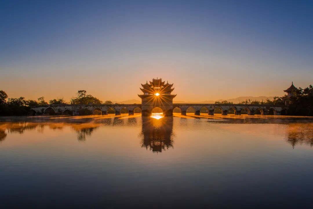 这座始建于清乾隆年间的古桥,桥长148米,造型典雅,气势恢宏;十七个桥孔如长虹卧波,桥面石板印满岁月痕迹。它作为建水历史与文化的重要见证,被列为国家级文物保护单位——正因如此,那一年一度的“金光穿孔”奇观,才被赋予了穿越历史的厚重与诗意。