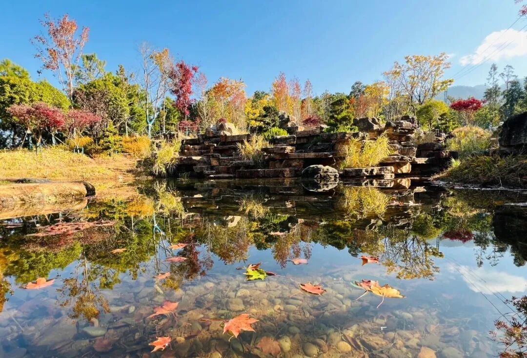水景观位于公园的中心,以羊坪水库的水为水源,利用山地地形高差,设置了池泽、阶梯叠水、假山瀑布、湿生植物岛等景观,丰富水景观的同时,也调节了生态环境。