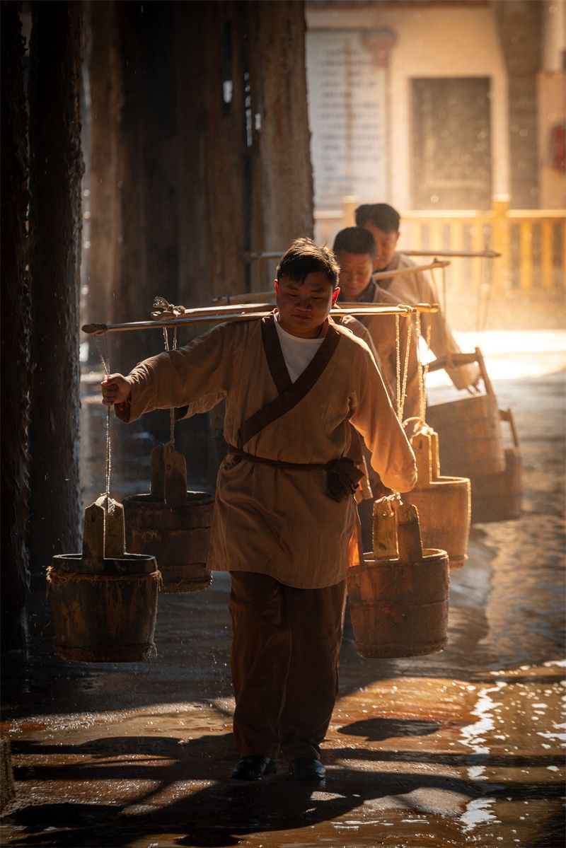 徜徉在古镇的街巷,看看那些巨大的水车、层层叠叠的晒卤台、煎盐的工棚……可以想象,这里曾商贾云集、市场繁荣。