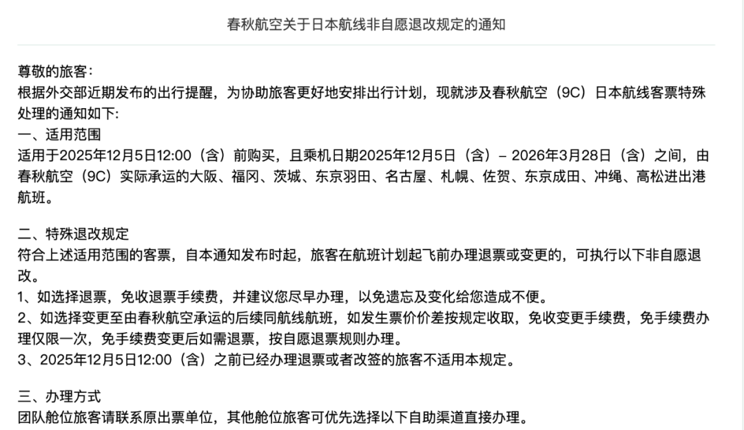 11月15日起,多家航司就相继发布日本航线客票特殊处理的通知,行程日期在2025年11月15日(含)至2025年12月31日,对于符合条件的客票可以免费退改。