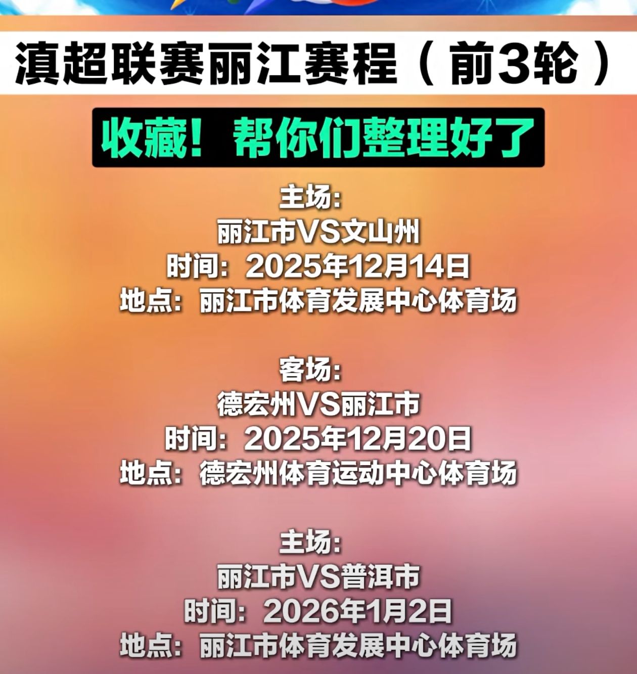作为“高原足球训练宝地”,丽江的海拔与气候将为赛事增添独特看点,12月14日,作为丽江的主场,本土球队的耐力优势与文山队的顽强拼搏将碰撞出激烈火花。同时,为球迷朋友们献上滇超联赛丽江赛程(前3轮),以便各位球迷朋友的出行安排。