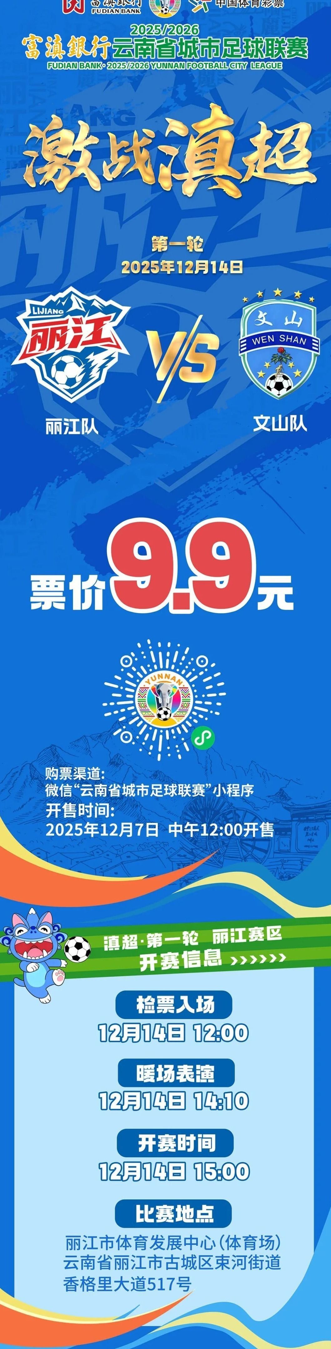 12月7日起丽江购票渠道已开,仅需9.9元即可畅享热血赛事。球迷可通过“云南省城市足球联赛”微信小程序直接购票,购票成功后,需凭购票人身份证核验入场,记得提前规划好行程,避免耽误观赛哦。