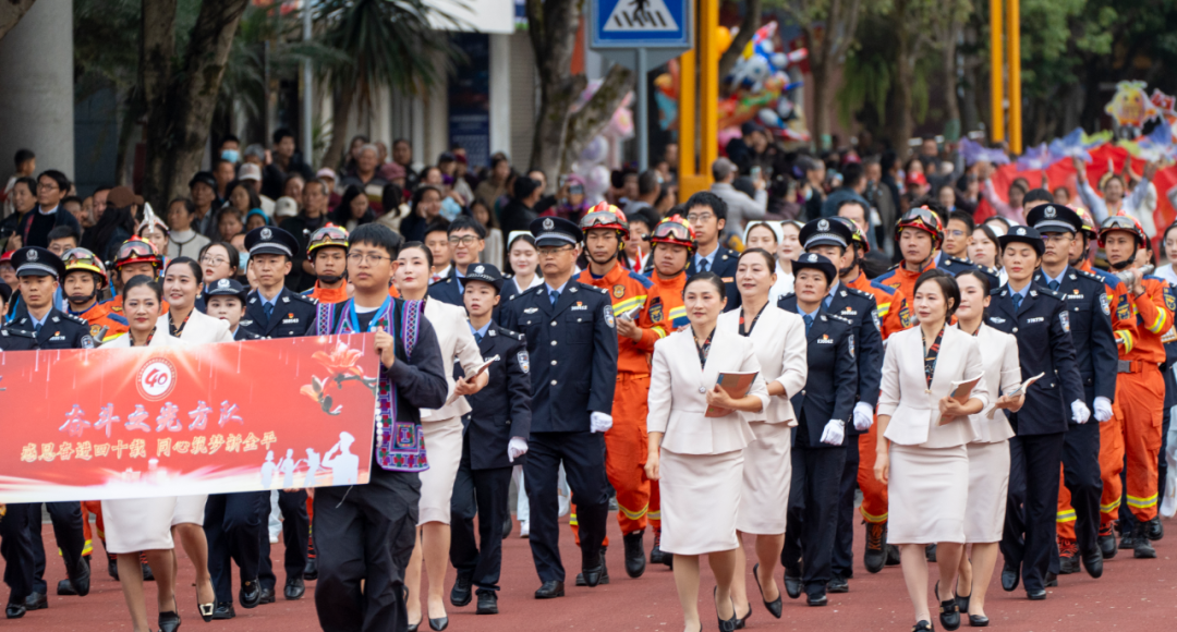 清晨7点40许,迎着冬日的朝阳,15支巡游方队身着五彩盛装、载歌载舞,向着县国门文化交流中心进发,开启这场承载40年荣光与梦想的盛会。