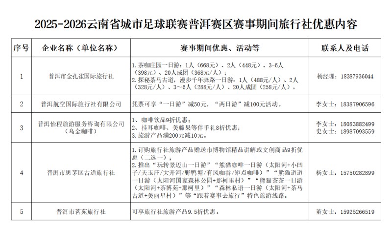 为了让您的“看滇超,逛普洱”之旅更加省心超值,普洱市文化和旅游局特联合本地各大旅行社推出“赛事观赛+景区游览优惠套票及定制行程”,涵盖热门景点门票、交通接驳及特色体验项目,助您一键解锁足球激情与普洱深度游玩!
