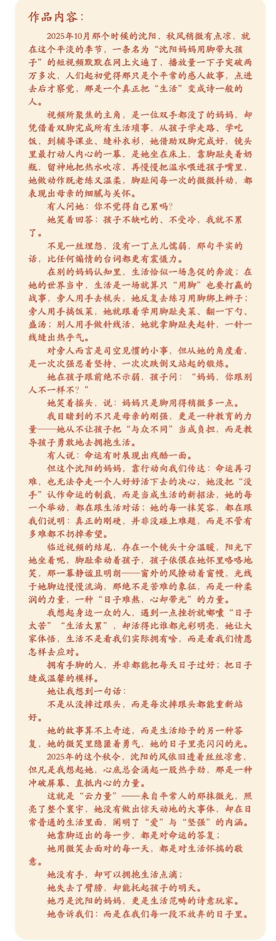 1.《沈阳妈妈用脚带大孩子:没手的她,把日子过成光》(汤继能)