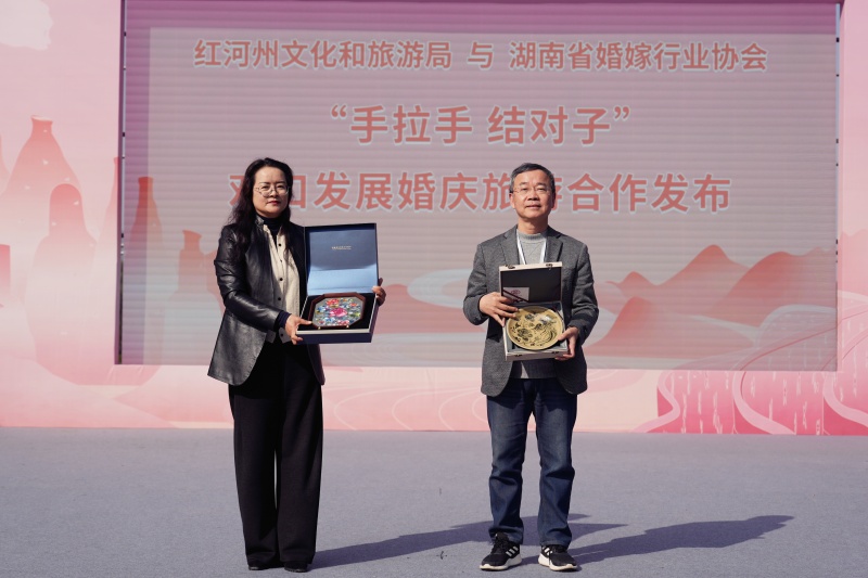推介会上,红河州文化和旅游局与湖南省婚嫁行业协会签署了“手拉手 结对子”对口发展婚庆旅游合作协议,并举行了湖南省婚嫁行业协会驻弥勒东风韵景区服务点揭牌仪式,标志着两地婚庆旅游合作正式开启。与会嘉宾还参与了红河州特色婚服展示与沉浸式互动体验,感受红河州婚俗文化的独特魅力。