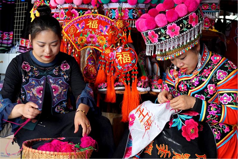 牟定县彝和园民族特色浓郁,街边琳琅满目的彝族绣坊吸引着众多游客,色彩艳丽的彝族服饰、鞋帽、腰带、荷包等文创产品做工精细、构图精美、色彩艳丽、韵味十足,让人应接不暇。