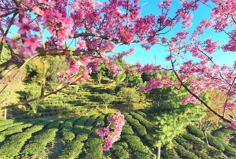 以翠绿的茶园为底色,白竹山冬樱花悄无声息地开了,一簇簇、一朵朵……在暖阳中盛放,与蓝天交相辉映,浪漫极了。