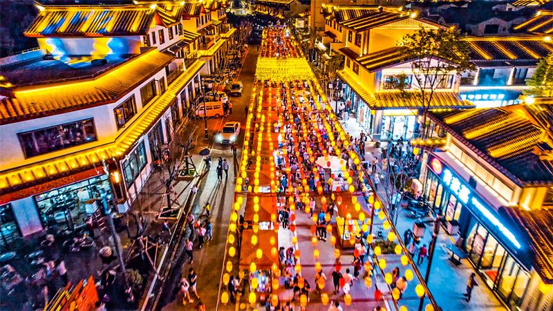 待夜幕降临,各色灯火点缀金山古镇的黑夜,或流光溢彩、或含蓄委婉,绚丽灯火包裹下的亭台楼阁、轩榭廊舫、小桥流水,都展现出旖旎的风情。