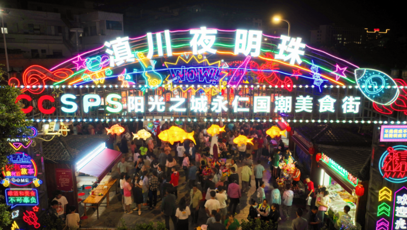 滇川夜明珠集市汇聚了川味美食、彝族美食和各地特色小吃,每当夜幕降临,当地群众及广大游客穿梭在各个摊位前,酸辣粉、烤串、奶茶等各类美食琳琅满目,商家的叫卖声、食客的交谈声、游客爽朗的笑声此起彼伏,人间烟火气十足。