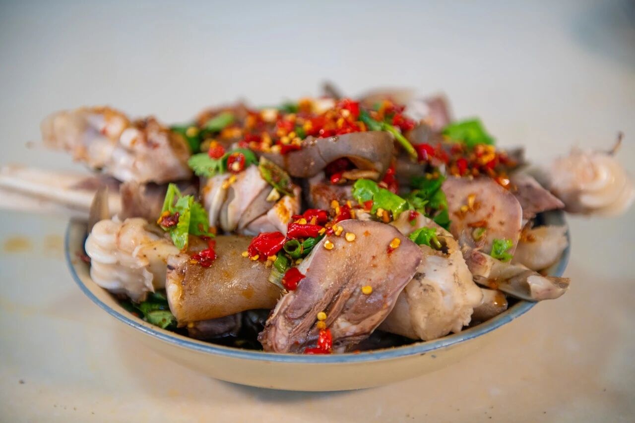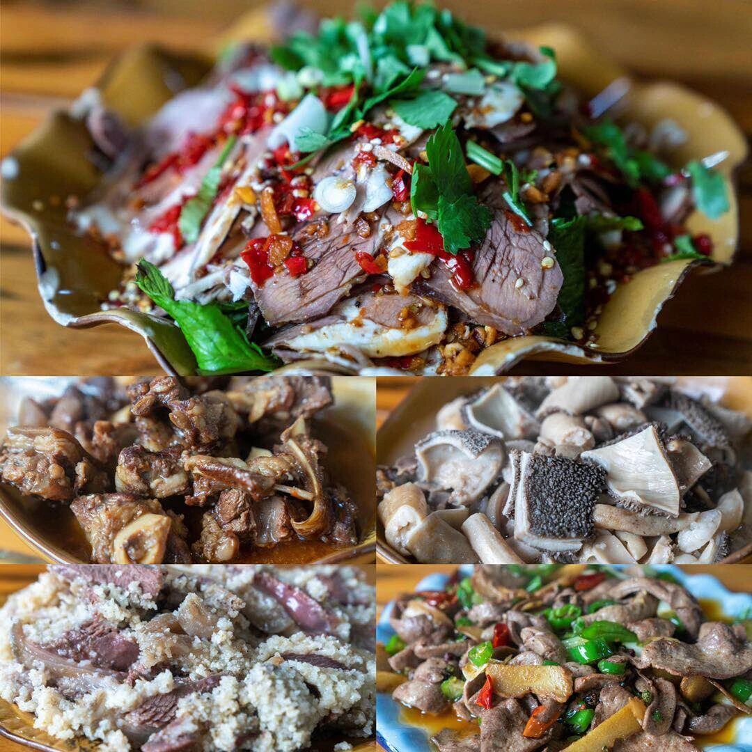羊全席选用本地散养的小耳朵黑山羊,肉质紧实不膻,从彝族先民的饮食智慧中传承而来的做法,将羊的每一处都化为惊喜:粉蒸羊肉裹着米面香,蒸得软糯脱骨,撒上炭火辣椒面更添层次;红烧羊排色泽红亮,酱汁牢牢锁住肉汁,入口鲜香味厚;麻辣羊血嫩滑爽口,油炸羊胸叉香脆带劲,就连凉拌羊蹄也辣得酣畅、嚼得弹牙,清汤羊杂更是鲜醇滋补。每一种技艺都发挥到了极致,将羊肉的每一分风味都展现得淋漓尽致。