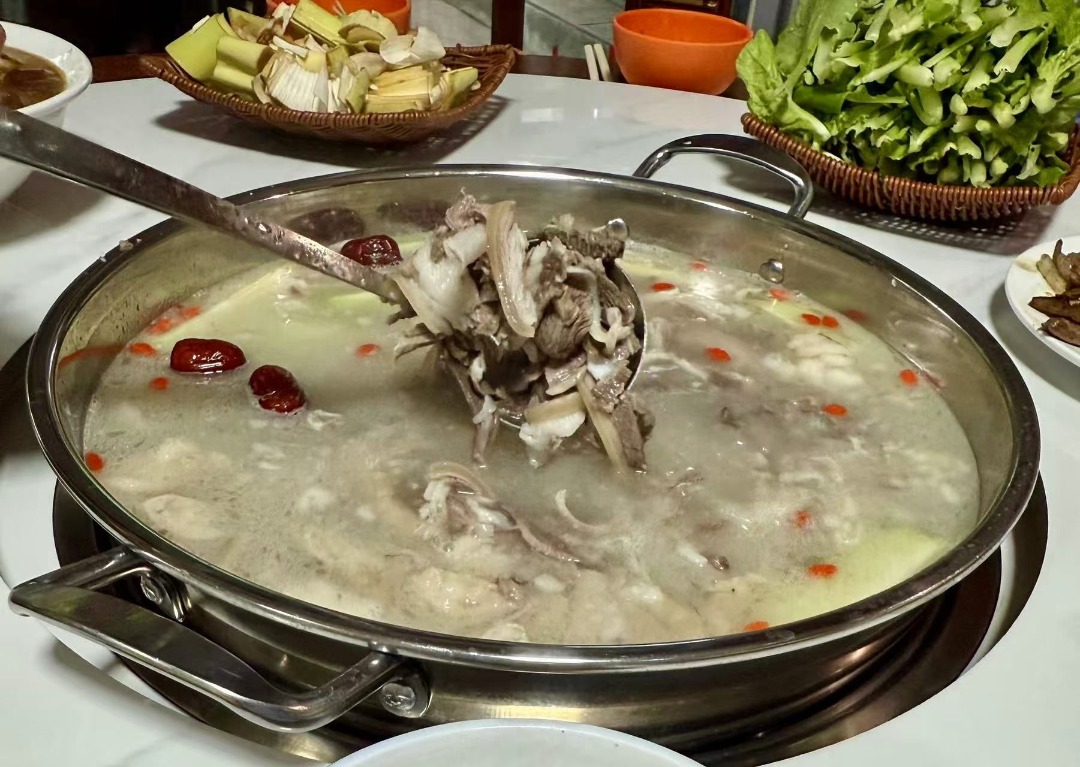 哀牢山的黑山羊火锅,吃的是一个“野”字与“热”字。火锅居中,汤底或许只用几段葱姜、几粒花椒,便激发出羊肉的本味。大块带皮羊肉在滚汤中起伏,皮糯肉香,饱吸汤汁。人们围坐一起,筷子在锅中交汇,话题与笑声随蒸汽一同升腾。窗外是哀牢山清冷的山风,屋内是近乎沸腾的满足。这既是山民对抗寒冬的智慧,也成了都市人向往的山林热望。