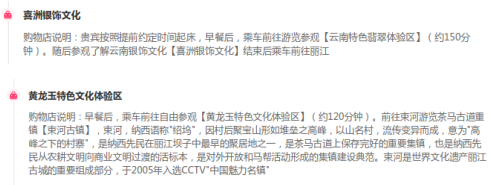 2025年12月17日,监测到标题为“昆明大理丽江。雪山索道+歌舞表演+洱海游船”的旅游产品,涉及“喜洲银饰文化、黄龙玉特色文化体验区”两个购物点。