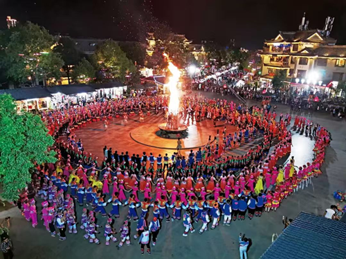 ▲楚雄州各族群众在彝人古镇景区欢歌载舞、其乐融融。