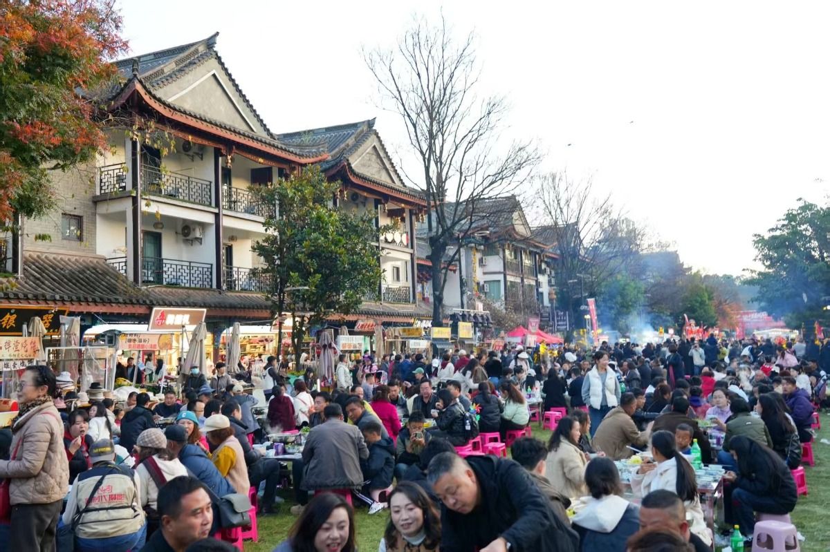 如果说文艺演出是视听盛宴,那么“舌尖上的彝族年”则带来了味觉的狂欢。备受期待的千人长街宴以青松针铺就“天然地毯”,仪式感十足。热气翻腾的羊汤锅、鲜香醇厚的坨坨肉、清香软糯的荞粑粑,再搭配彝家人自酿的甘醇米酒,每一道美食都饱含民族特色,地道的年味在一筷一勺间流淌。