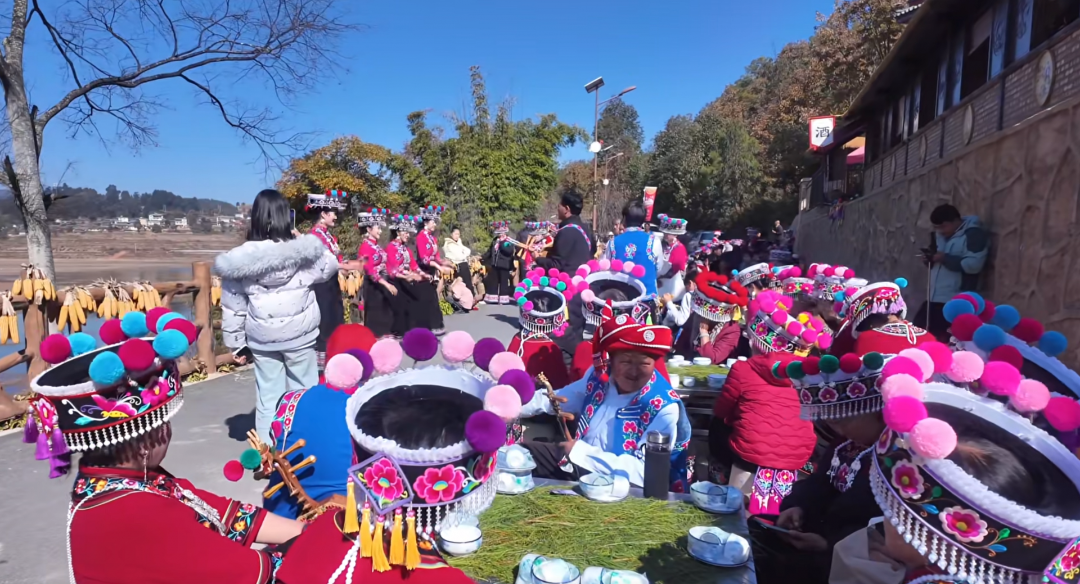 在牟定庆丰湖石垭口李家,“庆丰哩”村舞大赛活力四射,毕摩祈福仪式庄重肃穆,乡村集市上农特产品琳琅满目。傍晚,彝家长街宴热闹开席,让游客在味蕾盛宴中深深感受到彝家待客的真诚与热情,呈现出一场原汁原味的乡村彝族年盛会。