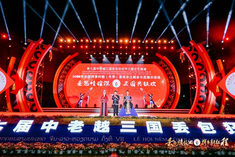 2023年普洱市江城县的“冬季”村晚,结合了“中老越三国丢包狂欢节”开展,还邀请了老挝丰沙里省,越南奠边府市、勐念县、勐谍县参加展演,展示中老越三国边地各民族风情风貌、生产生活实景等文化内涵,更展现了中老越三国与邻为善、以邻为伴、兼容并蓄、文明互鉴的美好愿景。