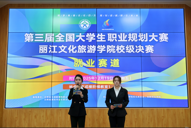近日,第三届全国大学生职业规划大赛丽江文化旅游学院校级决赛在文成楼阶梯教室圆满落幕。本次大赛由学校招生就业处、创新创业学院主办,大学生就业促进会协办,大赛以“筑梦青春志在四方规划启航职引未来”为主题,不仅为学子搭建了职业探索与能力展示的优质平台,更彰显了学校深耕就业育人、赋能青年成长的责任担当。
